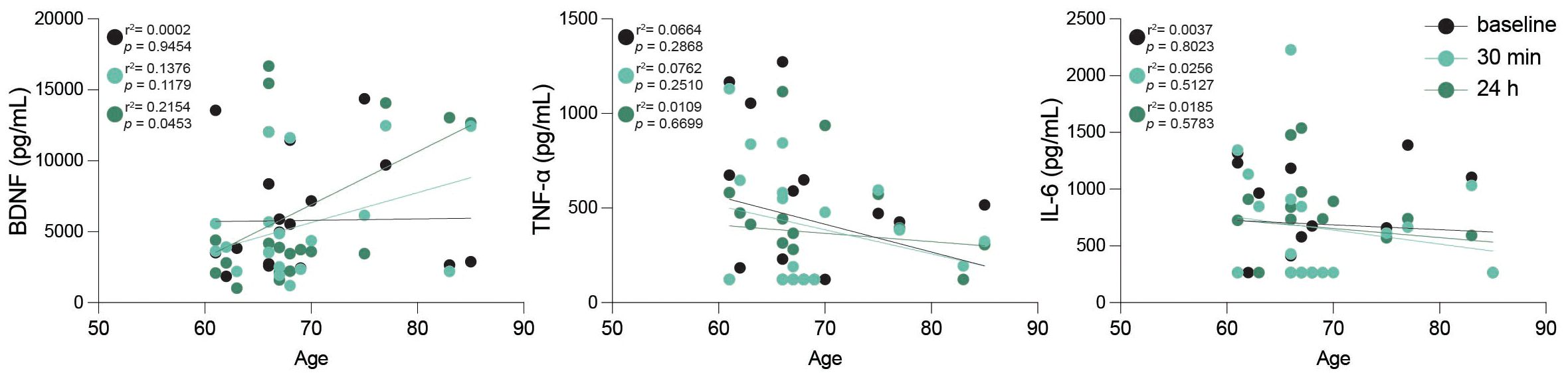 Figure 6. Peripheral BDNF correlates with age after intense exercise. Scatter plots including linear regression lines displaying peripheral levels of brain-derived neurotrophic factor (BDNF), tumor necrosis factor-alpha (TNF-α), and interleukin-6 (IL-6) in relation to age across the three studied time points: baseline (black), 30 min post-exercise (turquoise), and 24 h post-exercise (dark green). Data points represent individual participants, with black, turquoise and dark green colors indicating different time points as specified. r2 and p values are shown in plot; statistical analysis was performed using simple linear regression.