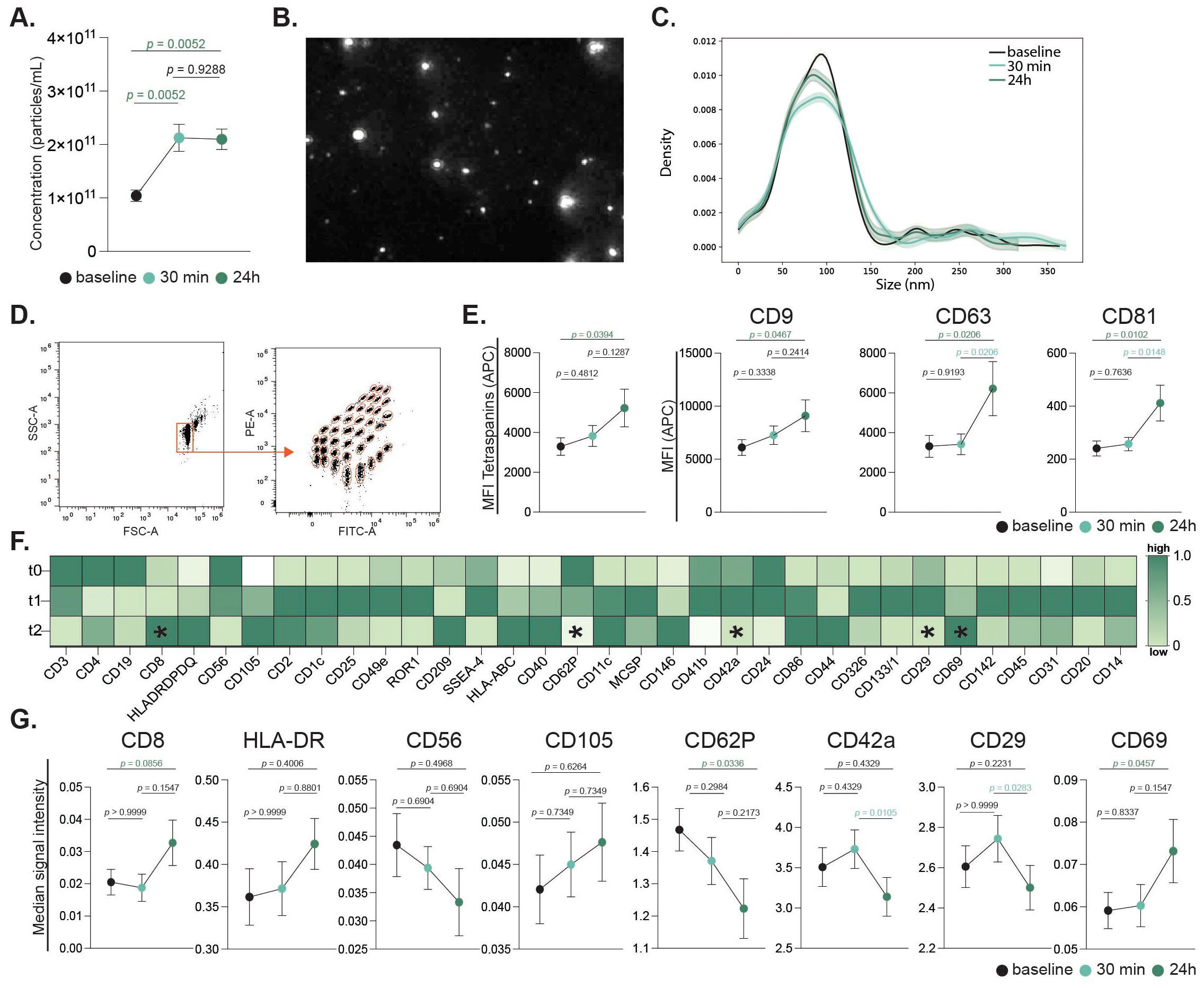 Figure 7. Extracellular vesicles release in response to acute continuous intensive exercise. Plasma-derived EV concentrations were quantified by nanoparticle tracking analysis (NTA) across all timepoints (A). Representative EV imaging (B) and size distribution histogram are shown (C). Bead-based flow cytometry assessed 37 EV surface markers, with representative gating and fluorescence profiles (D). Tetraspanin expression (CD9, CD63, CD81) is presented as mean ± SEM and individual values (E). Heatmap showing normalized mean fluorescence intensity (MFI) of 34 differentially expressed markers scaled to tetraspanin expression (CD9, CD63 and CD81). Rows represent timepoints (pre-, 30 min, and 24 h post-exercise); columns represent markers. Colors indicate relative expression (dark green = higher, light green/white = lower). Asterisks denote significant changes between timepoints (F). Signal intensities of selected immune, endothelial, and platelet-derived markers (CD8, HLA, CD56, CD105, CD62P, CD42a, CD29, CD69) are shown (G). Statistical analysis used mixed-effects modeling with Geisser-Greenhouse correction and Tukey’s test. p values are indicated in the figure.