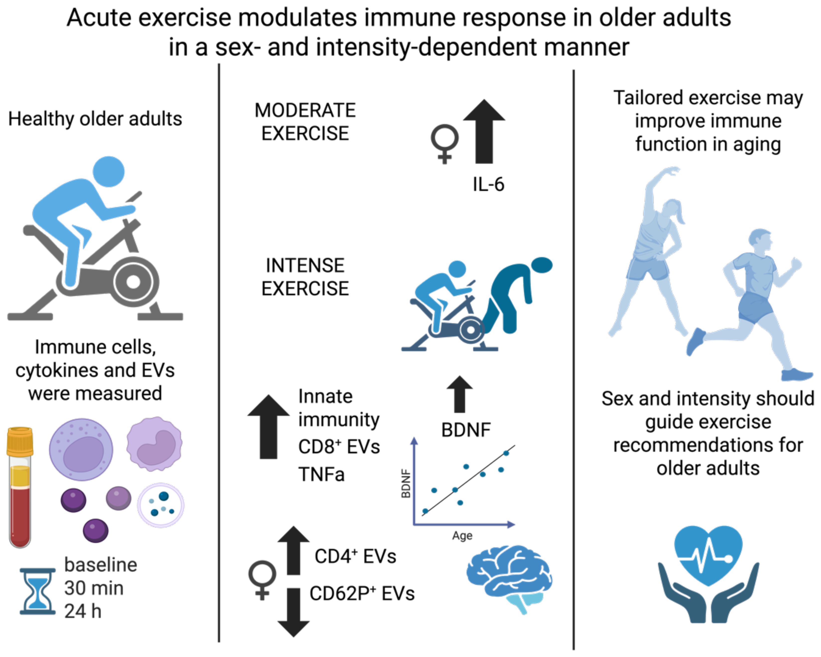 Physical activity confers numerous health benefits and is essential for promoting healthy aging. While evidence supports that exercise positively impacts outcomes and prognoses across numerous diseases in the elderly (14, 15), the underlying mechanisms of exercise-induced release, uptake, and communication of bioactive factors in older adults remain incompletely understood. This is especially true regarding sex-specific responses as males and females may exhibit distinct immune adaptations to exercise. Regular exercise modulates immune function by reducing systemic inflammation markers and attenuates age-related increases in proinflammatory cytokine levels, making it a powerful approach for mitigating inflammaging and mitigate chronic disease risk in older adults (10, 13, 16–19). Importantly, sex-specific differences in immune function suggest that personalized exercise regimens could optimize immune responses and overall health outcomes, highlighting the need for targeted approaches in exercise prescriptions for aging populations (20, 21).