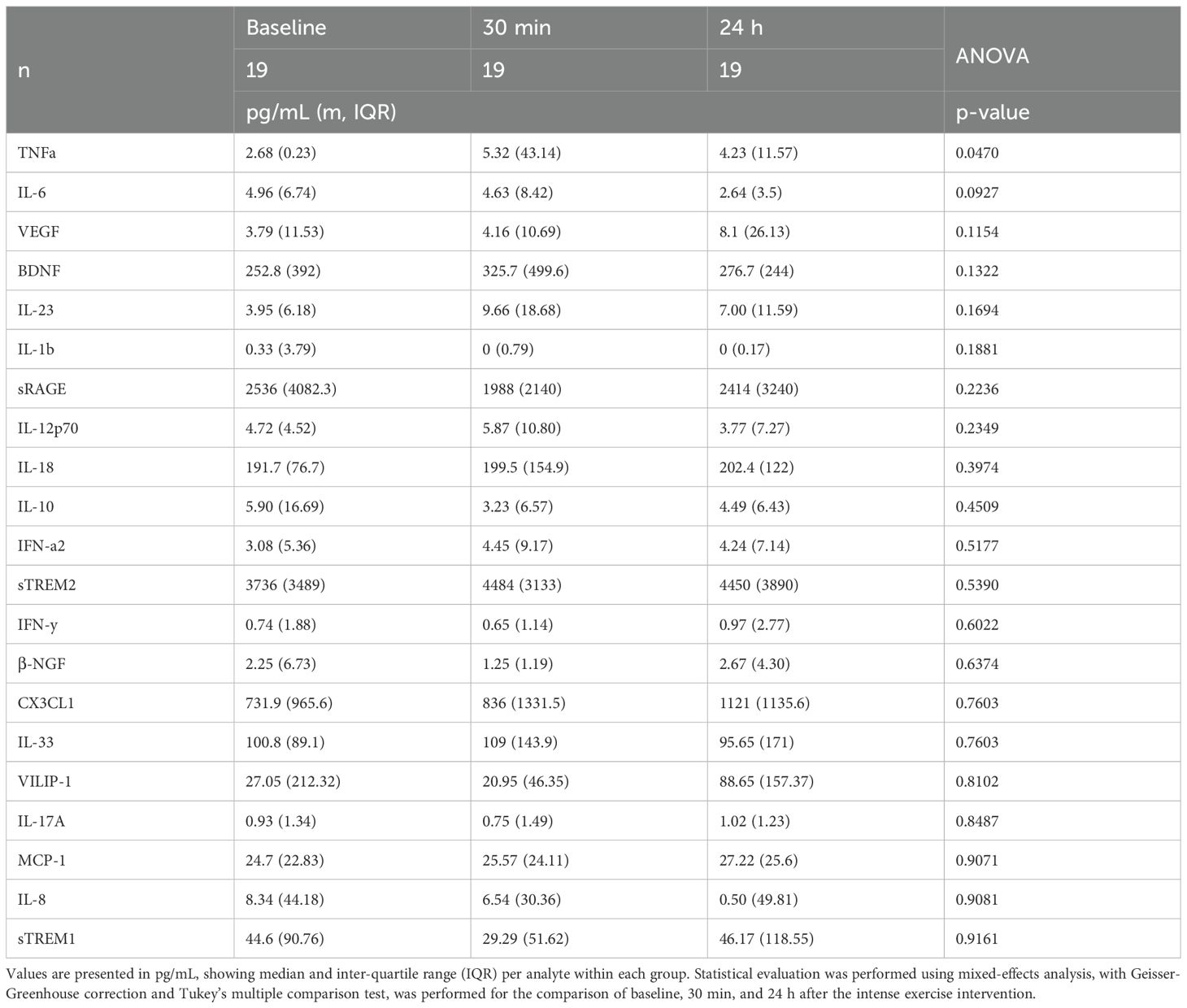 In contrast, other cytokines including IL-6, IL-10, IL-23, IL-12p70, IL-18, chemokines (MCP-1, IL-8, CX3CL1), and neurotrophic/vascular factors such as BDNF, VEGF, β-NGF, and soluble receptors (sRAGE, sTREM1, sTREM2), remained largely unchanged suggesting that the cytokine signature of intense exercise in older adults is relatively restricted. Further studies with larger cohorts are needed to fully elucidate the broader immunological impact of intense physical activity in older individuals.