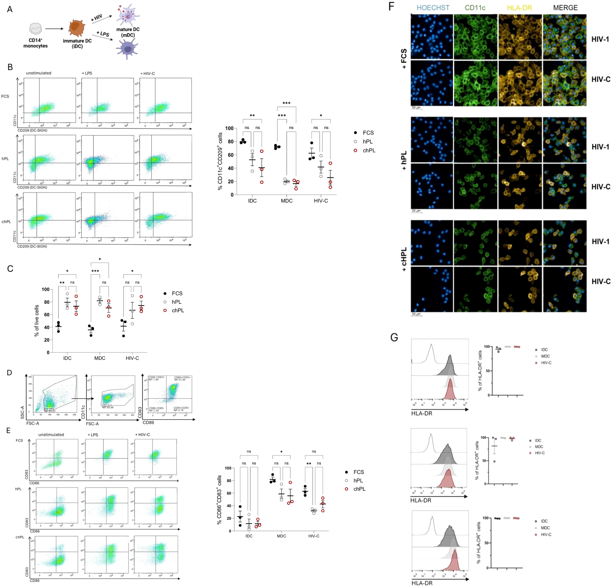 (A) Schematic overview of human primary monocyte derived DCs (iDCs) stimulated with bacterial or viral stimuli to induce maturation (mDCs). The figure was generated using BiorenderTM (license owned by Medical University of Innsbruck). (B) CD14+ monocytes were stimulated with 200 U/ml IL-4 and 250 U/ml GM-CSF grown in either FCS-based medium or hPL-based medium with or without FCS-pre-coating. Immature cells were stimulated for 24h with either 100 ng/ml LPS or 50 ng/ml HIV-C. On the left a representative dot plot of CD11c and CD209 (DC-SIGN) expression is depicted of unstimulated iDCs, LPS-stimulated mDCs (+LPS) or HIV-C-stimulated DCs (+HIV-C), on the right the summary of three independent donors of % CD11c/CD209 double-positive DCs is shown (n= 3± SEM). A 1-way ANOVA with Tukey´s multiple comparison test to evaluate effects of FCS, hPL or chPL on DC phenotype was performed, with *p<0.05, **p<0.01, ***p<0.001, ****p<0.0001. (C) Graph shows the survival of cells (% of viable cells) post infection depending on the growth medium and the treatment. 3 biological replicates were performed and % of live cells was statistically evaluated using GraphPad prism. A 1-way ANOVA with Tukey´s multiple comparison test to evaluate effects of FCS, hPL or chPL on DC phenotype was performed, with *p<0.05, **p<0.01, ***p<0.001, ****p<0.0001. (D) Representative dot plots of the gating strategy used to classify activated CD83+CD86+moDCs. Firstly, FSC-A vs. SSC-A dot plot and doublets were excluded. Immune cells were analyzed for DC marker CD11c. CD11c+ cells were finally gated for double expression of CD83 and CD86. (E) Immature moDCs were stimulated for 24h with either 100 ng/ml LPS or 50 ng/ml HIV-C and analyzed for the expression of CD83 and CD86. (n= 3± SEM, 1-way ANOVA, corrected with Tukey multiple comparison test, *p<0.05). On the left a representative dot plot of CD83 and CD86 expression is depicted of unstimulated iDCs, LPS-stimulated mDCs (+LPS) or HIV-C-stimulated DCs (+HIV-C), on the right the summary of three independent donors of % CD86/CD83 double-positive DCs is shown (n= 3± SEM). A 1-way ANOVA with Tukey´s multiple comparison test to evaluate effects of FCS, hPL or chPL on DC phenotype was performed, with *p<0.05, **p<0.01, ***p<0.001, ****p<0.0001. (F) Immature moDCs were stimulated for 24h with either 100 ng/ml LPS (not depicted), 50 p24 ng/ml of non-opsonized (HIV-1) or opsonized or(HIV-C) HIV-1. Representative staining of the DC phenotype (CD11c in green, HLA-DR in yellow) and infection by confocal microscopy are illustrated. Nuclei were visualized with Hoechst. Scale bars 50µm (underneath the pictures). Experiments were performed three times in independent biological replicates and counting at least 200 cells per condition. (G) Representative FACS plot and analysis of immature moDCs stimulated for 24h with either 100 ng/ml LPS, 50 ng p24/ml HIV-C to monitor the percentage of HLA-DR+ cells. (n= 3± SEM (biological replicates)).Data were analyzed using 1-way ANOVA, corrected with Tukey multiple comparison test. No significant differences between conditions (iDC, mDC, HIV-C-DC) were detected.