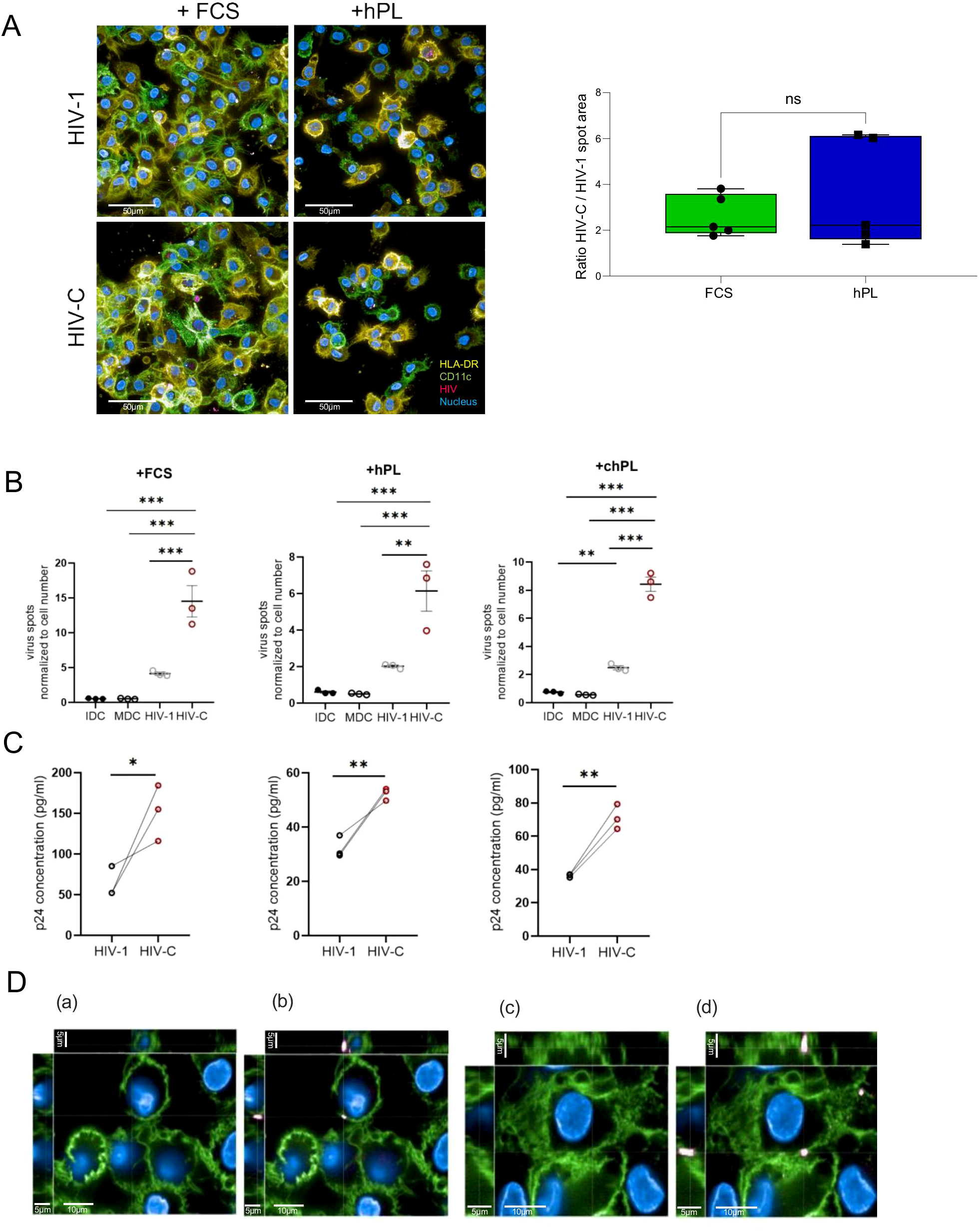 (A) (Left) Representative image of infection analysis of moDCs via confocal microscopy investigation of mCherry-HIV levels. MoDCs grown under FCS or hPL conditions were treated for 24h with either 50 ng/ml HIV-1 or HIV-C. Cells were stained for HLA-DR (yellow), CD11c (green), nuclei (blue) and virus (pink). Overlays are depicted. (Right) Virus areas were quantified using the Harmony 4.8 software (Perkin Elmer) in five independent spots for HIV-1 or HIV-C-exposed DCs and ratios were calculated using GraphPad prism. No significant differences were observed. At least 200 cells per condition were evaluated. Enhancement of infection in HIV-C- compared to HIV-DCs was observed in FCS- and hPL conditions. (B) Quantification of virus particles normalized to the cell number in moDCs grown under FCS, hPL or chPL condition. (n= 3± SEM, 1-way ANOVA, corrected with Tukey multiple comparison test, *p<0.05, **p<0.01, ***p<0.001). (C) Detection of HIV-1 p24 antigen via quantitative p24 ELISA in moDCs grown under FCS, hPL or chPL condition stimulated with either 100 ng/ml LPS, 50 p24 ng/ml HIV-C or HIV-1. Measurements have been performed 210 min after substrate addition. The signal measurement is performed at λ = 550 nm. The signal for the background is measured at λ = 650 nm. For normalization, the blank value is deducted from the signals. (D) Cellular localization of virus particles between HIV-1 and HIV-C. DCs were stained for the expression of CD11c and the mCherry tagged virus particles. (a) illustrates pocket formation without m-cherry-channel in HIV-1 treated moDCs. (b) shows pocket formation with the mCherry-channel switched on in HIV-1 treated moDCs. (c) depicts co-localization of CD11c and HIV-C without m-cherry-channel turned on in HIV-C treated moDCs. (d) shows co-localization of CD11c and HIV-C with mCherry-channel depicted in HIV-C treated moDCs. These were common staining patterns across all conditions (FCS, hPL, chPL) and multiple cells.