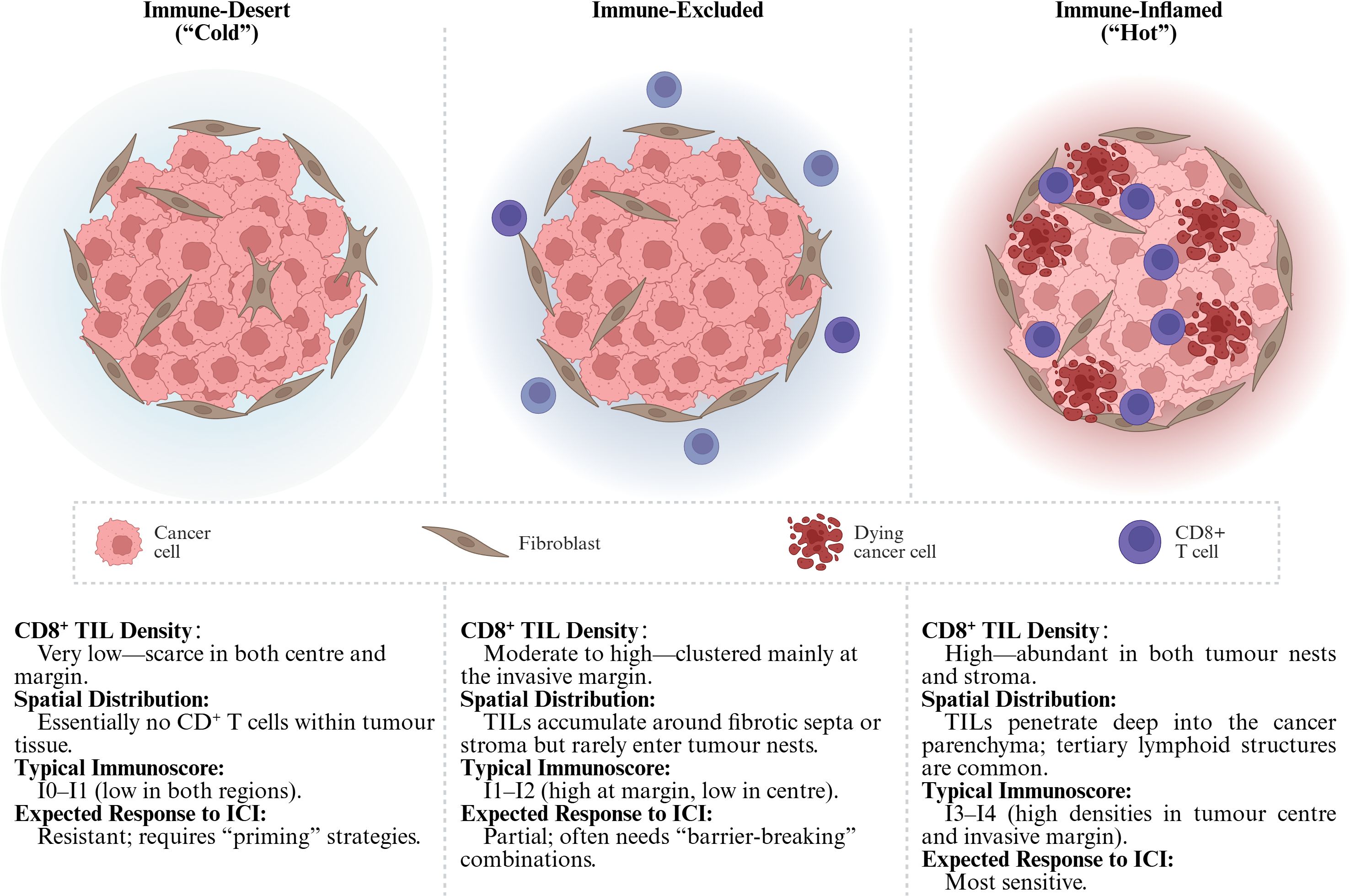 Large-scale profiling of solid tumors has converged on three recurrent patterns of CD8+ T-cell infiltration. Immune-inflamed (“hot”) tumors display dense CD8+ TIL dispersed throughout the cancer nests and stroma, often accompanied by an interferon-γ–rich cytokine milieu (8–10). Immune-excluded lesions harbor abundant CD8+ T cells, but these cells are trapped at the invasive margin or within fibrotic septa and seldom penetrate the parenchyma (11). At the opposite extreme, immune-desert (“cold”) tumors show a near-complete paucity of CD8+ T cells in both center and periphery (6). This inflamed–excluded–desert continuum is now widely used to stratify the baseline tumor immune contexture and to anticipate responses to immunotherapy (Figure 1).