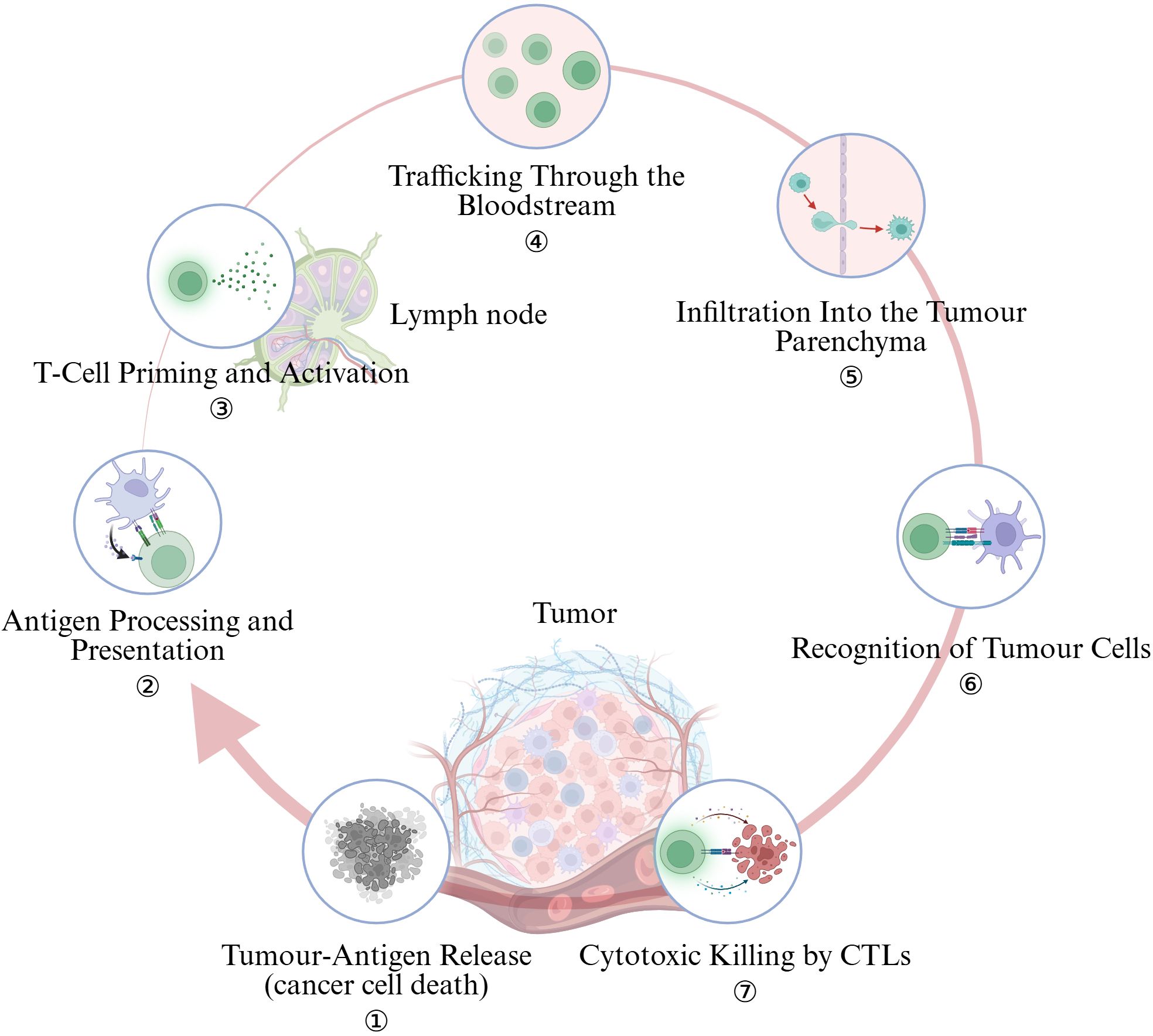 Figure 2. The cancer-immunity cycle encapsulates seven pivotal steps. (Created in BioRender. Lan, L (2025). https://BioRender.com/2294g5o).