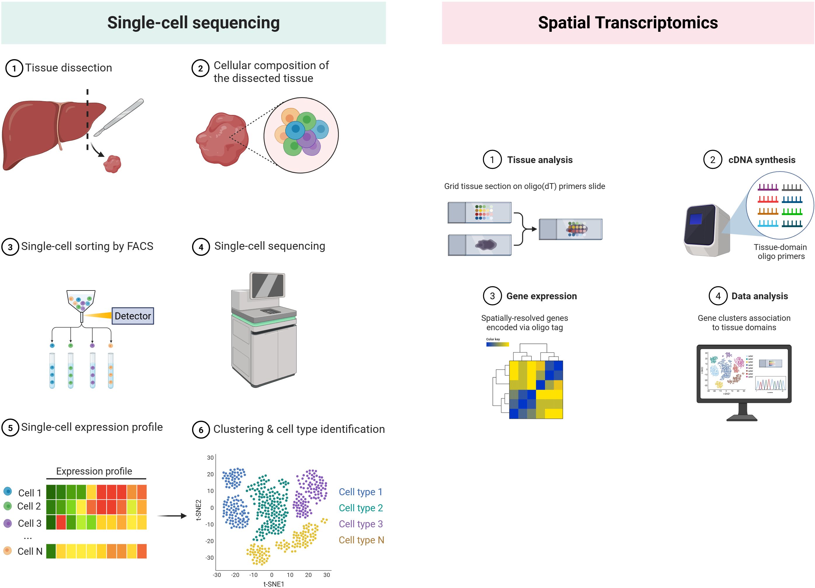 Figure 3. Single-cell sequencing vs spatial transcriptomics. (Created in BioRender. Lan, L (2025). https://BioRender.com/2294g5o).