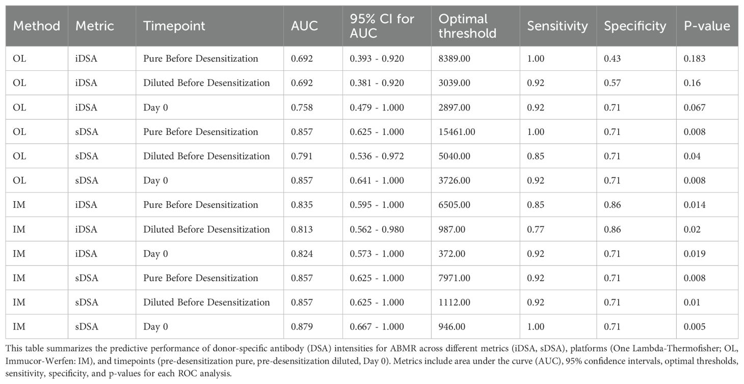 After desensitization, graft acceptance decisions should be guided by the immunological risk associated with preformed donor-specific antibodies (DSA). In this study, we identified, for the first time, predictive iDSA and sDSA thresholds for antibody-mediated rejection (ABMR). These thresholds enable risk stratification at the time of organ allocation, aiding in transplant acceptance decisions. MFI values from SAB assays are commonly used as surrogate markers for ABMR prediction and graft survival assessment (31). Vo et al. reported the incidence of ABMR in a cohort of 226 highly sensitized patients who underwent transplantation following desensitization. They concluded that the DSA-relative intensity scores at the time of transplant were strong predictors of ABMR (32). Using the OL assay on 432 sera, which were also tested in T-cell crossmatches (XMs), Visentin et al. demonstrated that the SAFB MFI threshold predicting T-cell flow cytometry crossmatch (FCXM) positivity ranged between 4,400 and 6,200 for class I DSA (33). Additionally, the threshold for predicting T-cell complement-dependent cytotoxicity crossmatch (CDCXM) positivity was found to be between 8,900 and 13,600. However, to date, no published data are available for the SAB assay from IM, and the lack of standardized MFI cut-offs across platforms remains a challenge. For the first time, we were able to determine specific MFI thresholds for both OL and IM before desensitization - on both pure serum and 1:10 diluted serum - as well as after desensitization, just prior to transplantation. Both OL and IM exhibited good predictive performance for ABMR across all time points, including diluted pre-desensitization samples. These findings highlight that both suppliers offer strong predictive value for ABMR, with IM showing a slight advantage in iDSA assessment and sDSA emerging as the most reliable predictor of ABMR across all conditions.