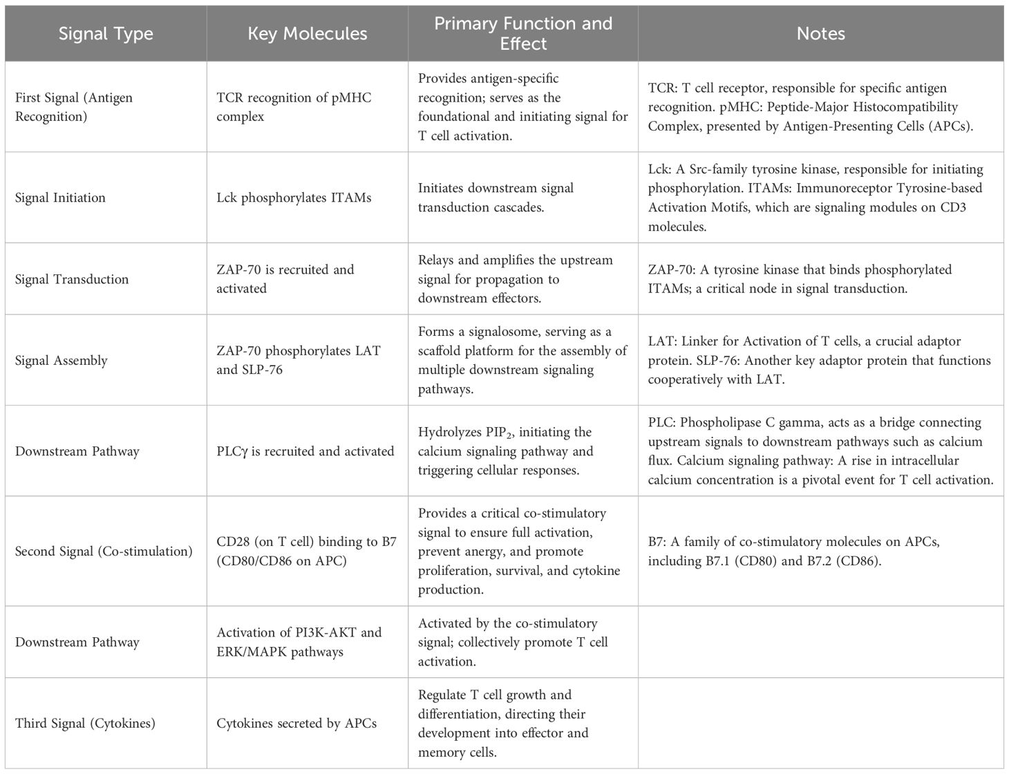 The design of CAR-T cells is a direct clinical application of these TCR signaling principles. CARs incorporate ITAM-containing CD3ζ domains to initiate activation and costimulatory domains (e.g., CD28, 4-1BB) to enhance T cell persistence and function. This synthetic biology approach exemplifies how targeted manipulation of T cell signaling pathways can generate potent antitumor immunity. Table 1 presents the mechanisms of T cell activation.