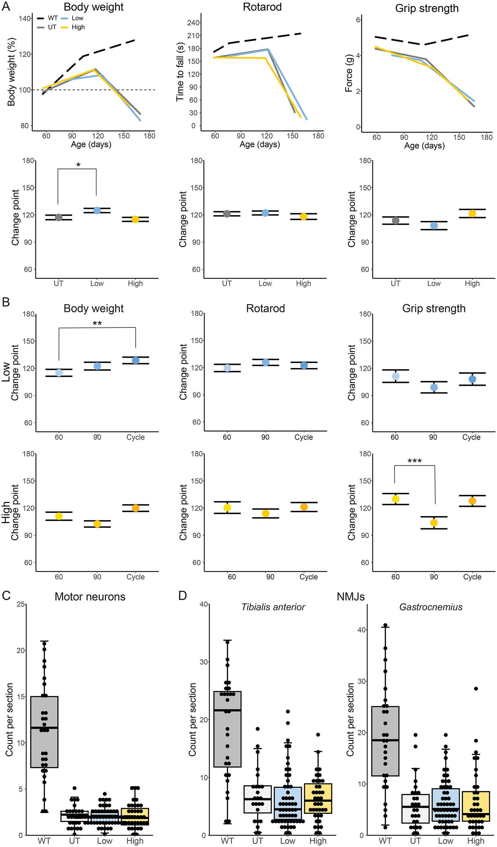 Segmented linear mixed models were used to determine the inflection point when loss of function began or accelerated for each group of mice, including loss of weight, grip strength, and agility. Body weight percentage was calculated using the body weight at 60 days of age as baseline.