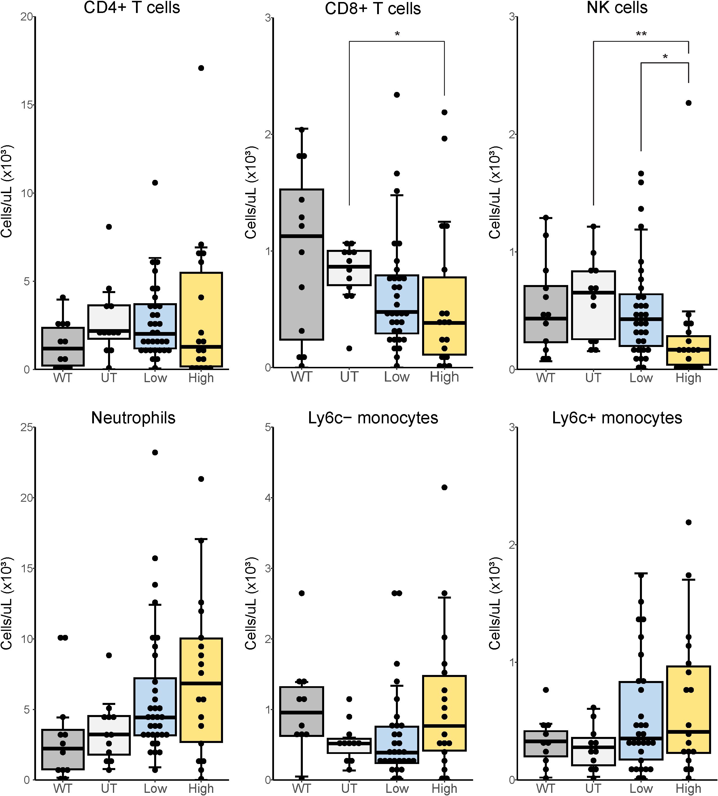 Figure 3. Immune phenotyping in peripheral blood of tofacitinib-treated and untreated SOD1G93A mice. SOD1G93A mice were sacrificed at end-stage disease with age-matched WT mice. Peripheral blood immune cell populations were analyzed via flow cytometry, as indicated. N = 63, 12–30 mice per group (CD4+ T cells, CD8+ T cells, NK cells, neutrophils); N = 59, 10–20 mice per group (Ly6c- and Ly6c+ monocytes). WT mice included for reference only and are excluded from statistical analysis. *p < 0.05, **p < 0.01, by Kruskal-Wallis with post-hoc Dunn’s test with Bonferroni correction.