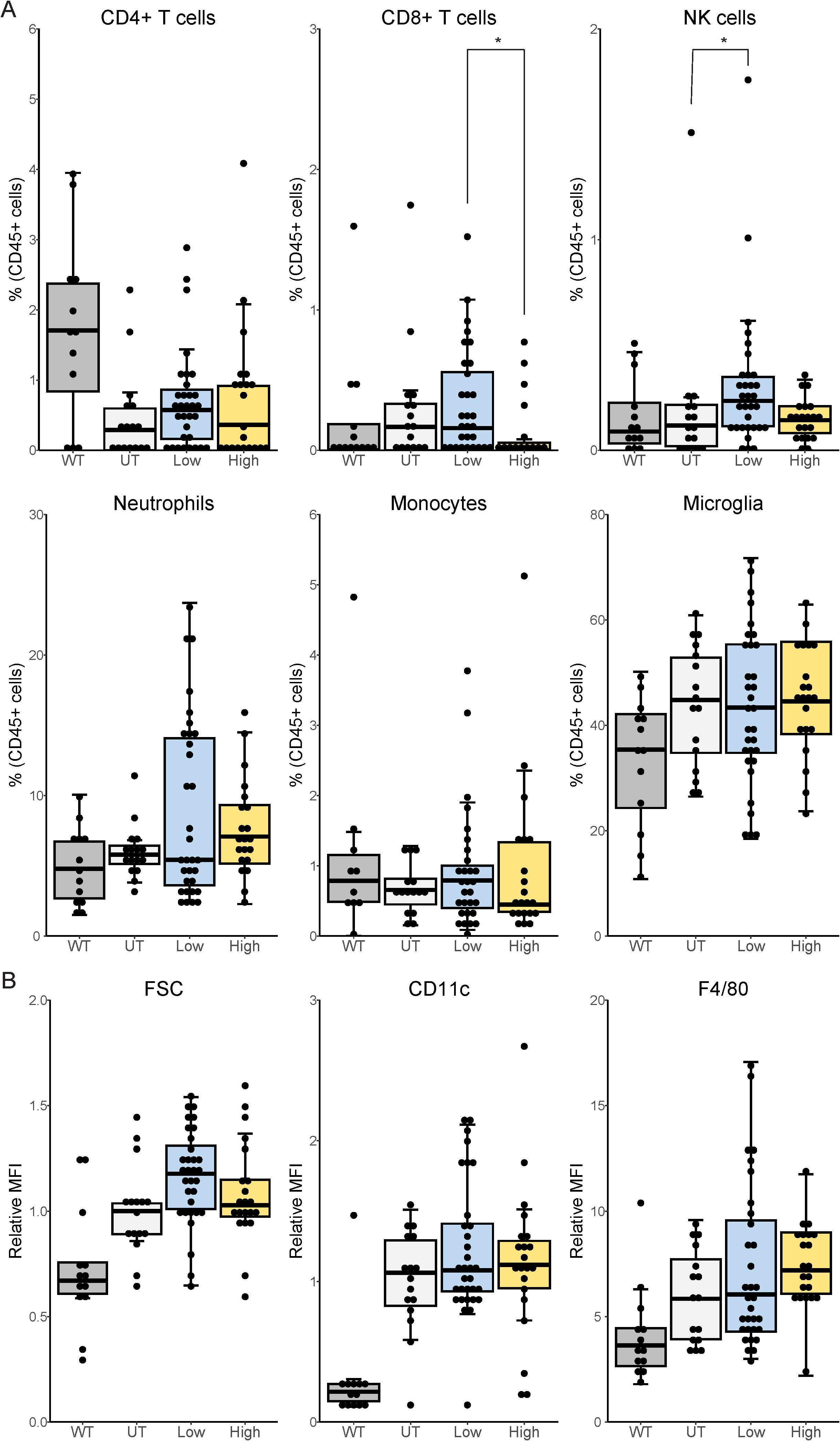 Figure 4. Immune phenotyping in the spinal cord of tofacitinib-treated and untreated SOD1G93A mice. SOD1G93A mice were sacrificed at end-stage disease and flow cytometry analyzed spinal cord immune cell populations. (A) Immune populations in the spinal cord. (B) Microglia phenotype markers. CD4+ T cells and neutrophils were normalized by cohort (A), as were forward scatter (FSC) and CD11c (B). N = 69, 13–32 mice per group. WT mice included for reference only and are excluded from statistical analysis. *p < 0.05, by Kruskal-Wallis with post-hoc Dunn’s test with Bonferroni correction or by one-way ANOVA with post-hoc Tukey test as indicated by a Shapiro-Wilk test using p=0.05.