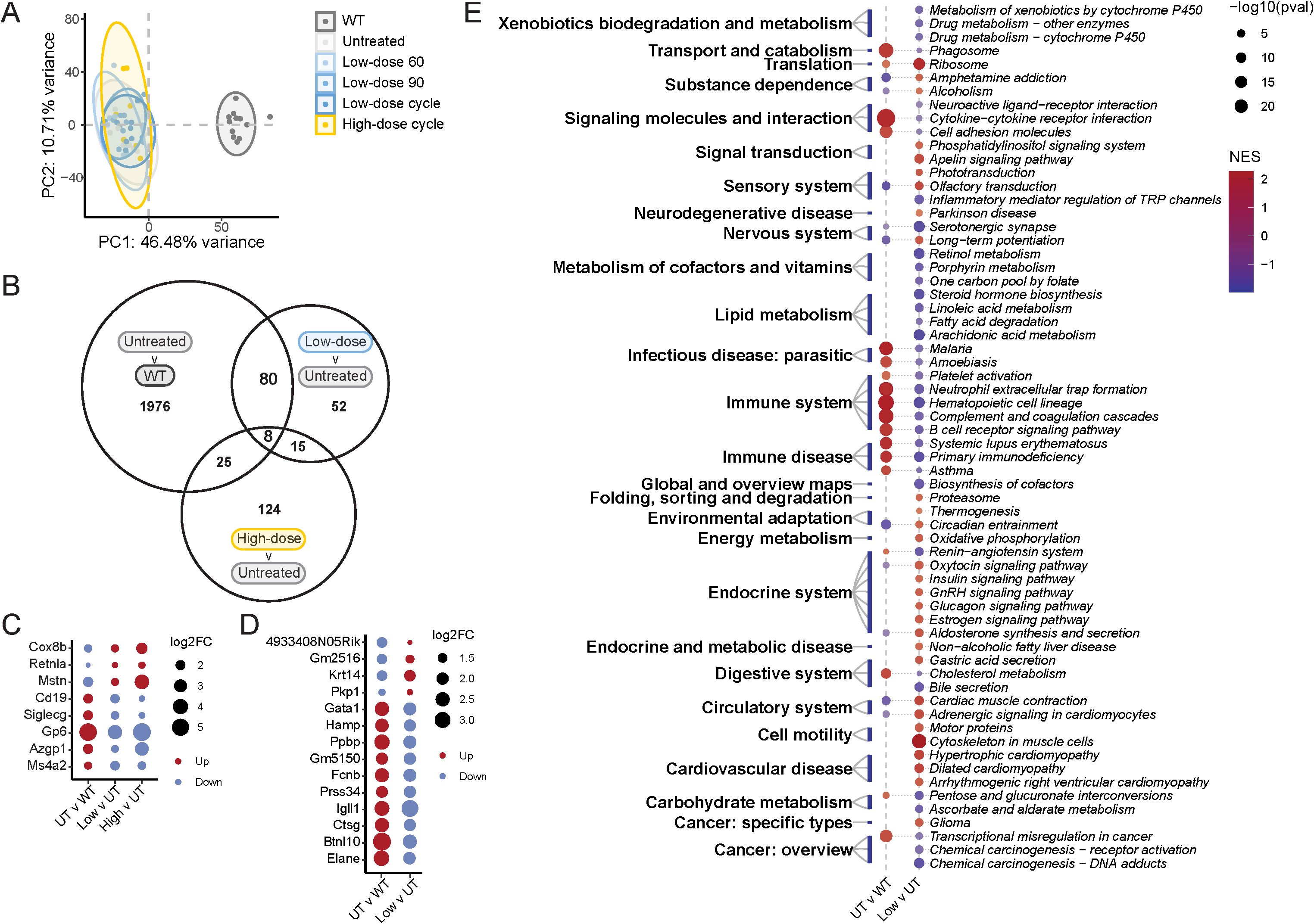 Figure 5. Transcriptomics analysis of spinal cord from tofacitinib-treated and untreated SOD1G93A mice. (A) Principal component analysis; color indicates treatment group after correction by cohort. (B) Comparisons of overlapping and unique differentially expressed genes (DEGs) across all three comparisons – untreated ALS versus untreated wild-type (UT v WT), low-dose tofacitinib versus untreated ALS mice (Low v UT), and high-dose tofacitinib versus untreated ALS mice (High v UT). (C) Expression levels of eight DEGs shared by all three comparisons. (D) Expression levels of top 10 DEGs each for untreated ALS versus untreated WT and low-dose tofacitinib versus untreated ALS by log2(fold-change) (log2FC). See Supplementary Table S3 for the complete list of DEGs. (E) Gene set enrichment analysis of untreated ALS versus untreated WT and low-dose tofacitinib versus untreated ALS. See Supplementary Table S4 for the complete list of GSEA results. A cutoff of p < 0.05 and |log2(fold-change)| > 1 was used to identify DEGs. N = 58, 8–12 mice per group (A), 8–28 mice per group (B-E).