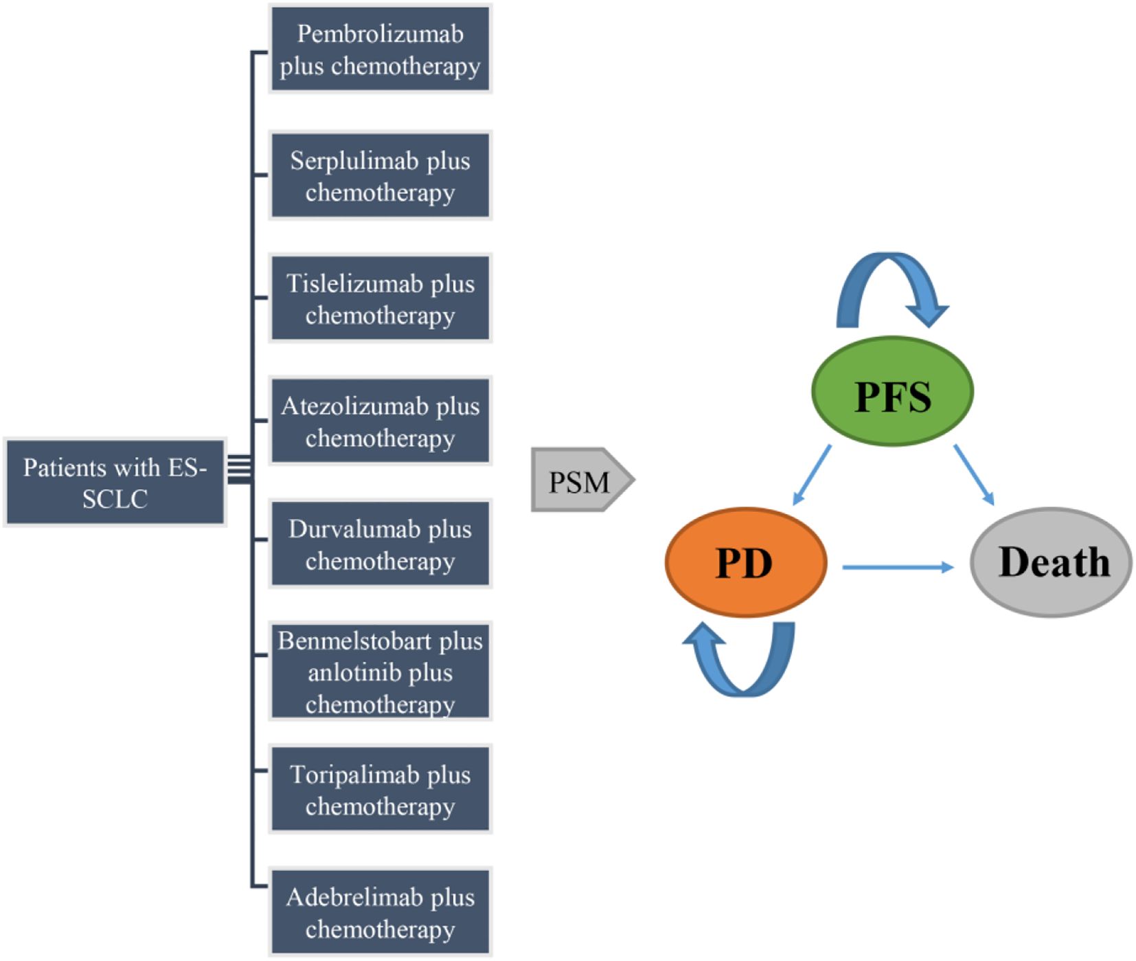 Figure 1. Structure of the partitioned survival model. ES-SCLC, extensive-stage small-cell lung cancer; PFS, progression-free survival; PD, progressed disease; PSM, partitioned survival model.
