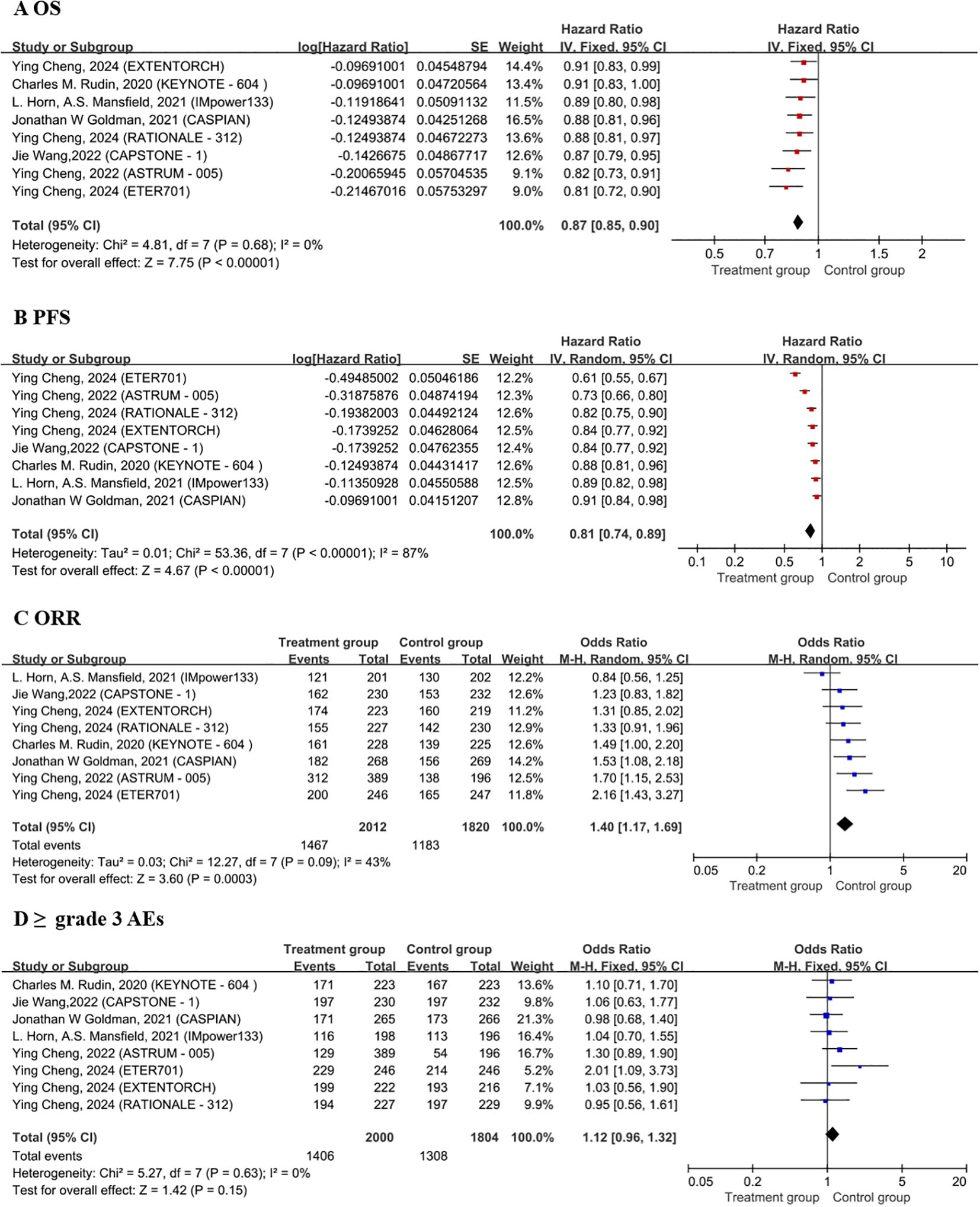 The risk of bias assessment indicated that most trials had low bias risk, except the CASPIAN study, which was an open-label, sponsor-blind clinical trial, and the IMpower133 study, which lacked blinding in outcome assessment (Supplementary Figure S7). Heterogeneity was evaluated using the I² statistics, indicating fixed-effect models for OS (I² = 0%) and ≥grade 3 AEs (I² = 0%) and random-effect models for PFS (I² >50%) and ORR (I² = 43%).