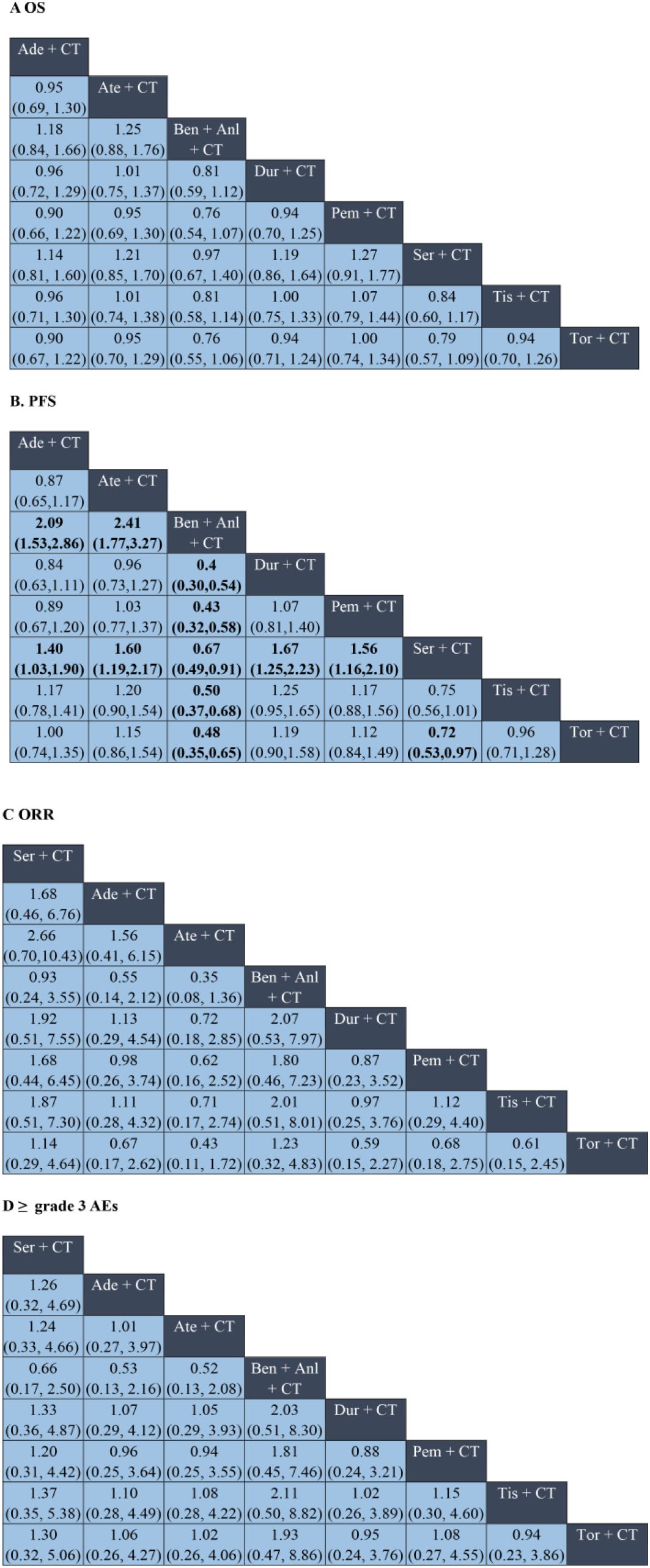 Figure 3. Network meta-analysis of ICI plus chemotherapy and ICI plus chemotherapy and anti-angiogenic regimens in ES-SCLC. Panels: (A) overall survival (OS); (B) progression-free survival (PFS); (C) objective response rate (ORR); (D) ≥grade 3 adverse events (AEs). In (A, B), cells display hazard ratios (HRs); in (C, D), cells display odds ratios (ORs). Cells are formatted as “effect estimate (95% CI)”; HR <1 (OR >1) indicates a superior row regimen than the column regimen; confidence intervals not crossing 1 denote statistical significance. Ade, adebrelimab; Ate, atezolizumab; Ben, benmelstobart; Anl, anlotinib; Dur, durvalumab; Pem, pembrolizumab; Ser, serplulimab; Tis, tislelizumab; Tor, toripalimab; CT, chemotherapy; CI, confidence interval.