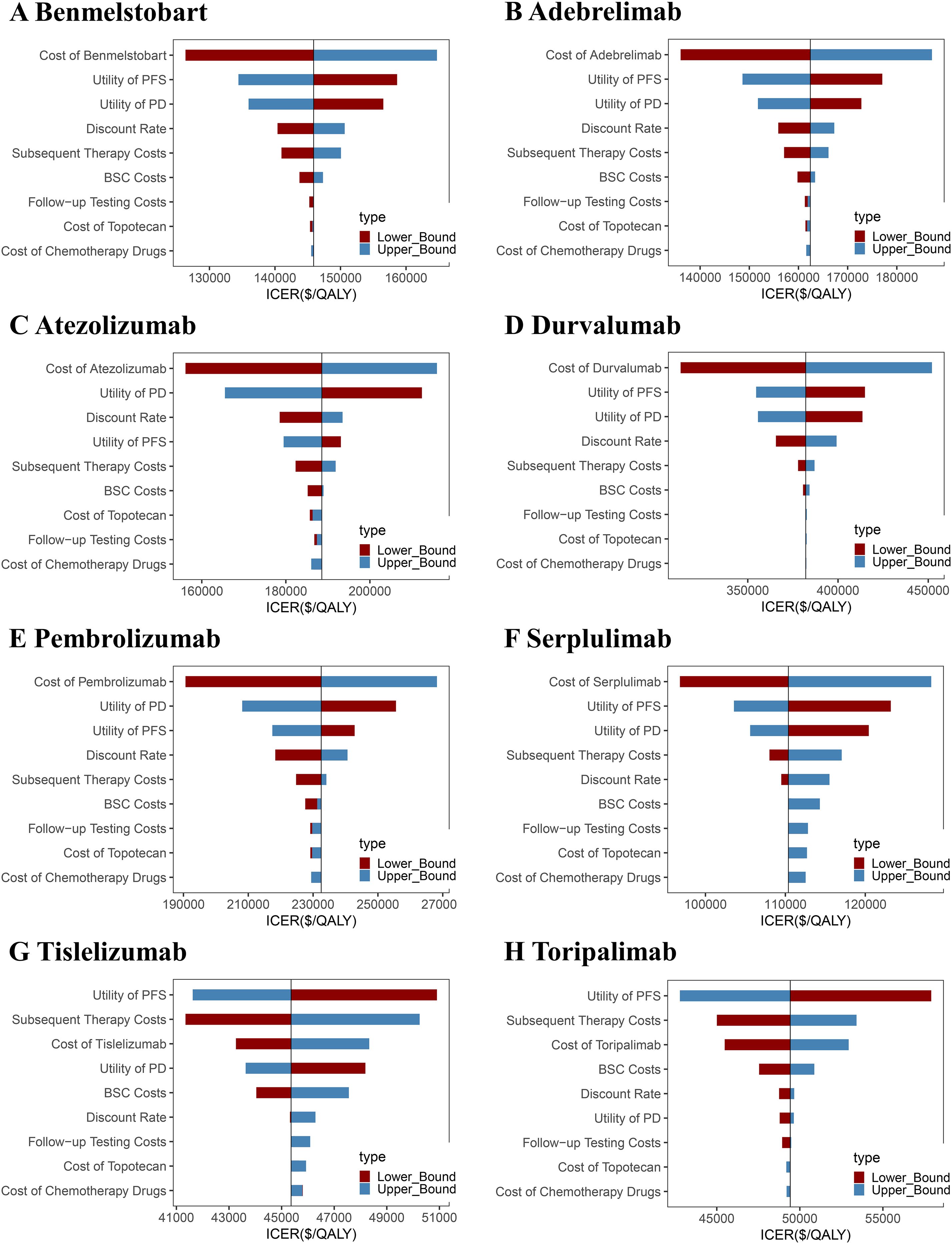 Figure 4. One-way sensitivity analysis tornado diagrams showing the parameters with the greatest impact on the ICER of each ICI-based regimen as compared to chemotherapy alone. (A) Benmelstobart, (B) Adebrelimab, (C) Atezolizumab, (D) Durvalumab, (E) Pembrolizumab, (F) Serplulimab, (G) Tislelizumab, and (H) Toripalimab. PFS, progression-free survival; PD, progressive disease; ICER, incremental cost-effectiveness ratio; BSC, best supportive care.