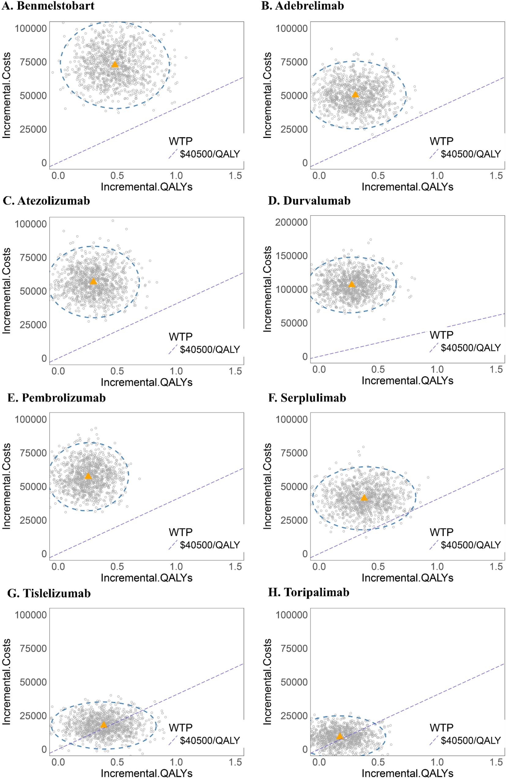 Figure 5. Probabilistic sensitivity analysis scatter plots for each ICI-based regimen as compared to chemotherapy alone. (A) Benmelstobart, (B) Adebrelimab, (C) Atezolizumab, (D) Durvalumab, (E) Pembrolizumab, (F) Serplulimab, (G) Tislelizumab, and (H) Toripalimab.