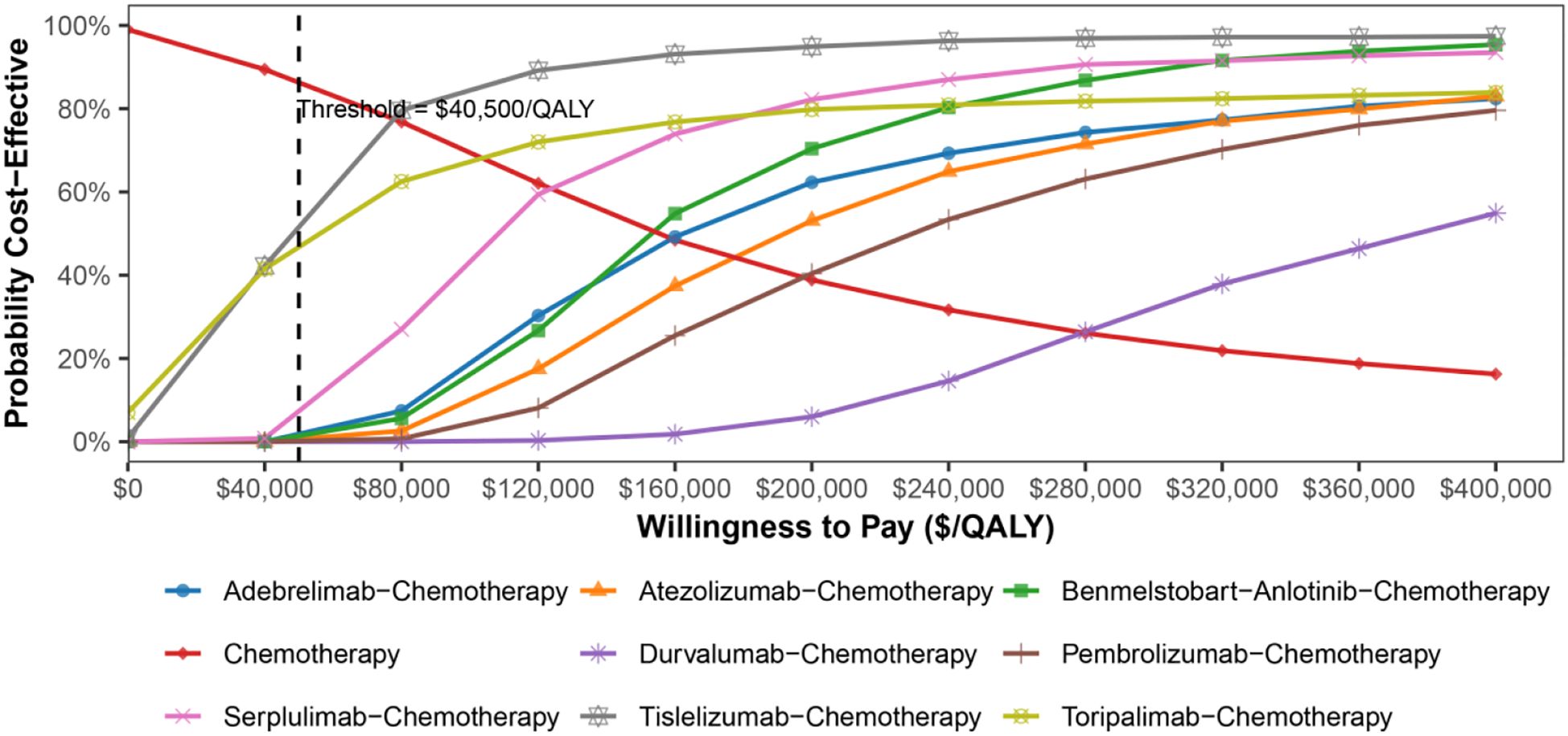 Nevertheless, none of the eight ICI-based regimens were cost-effective under the predefined WTP threshold of $40,500/QALY. While chemotherapy alone remained cost-effective, it offered limited clinical benefit. Despite benmelstobart providing the highest QALYs at 1.31, its substantial cost ($102,934.50) increased the ICER, thus diminishing its overall cost-effectiveness. On the other hand, tislelizumab, achieving 1.27 QALYs at a comparatively lower cost ($52,273.46), emerged as the most economically favorable option among ICI-based therapies. Sensitivity analyses highlighted that the key factors affecting ICER estimates included drug costs and health state values for PFS. In PSA, tislelizumab and toripalimab showed measurable economic superiority as compared to other ICI-based regimens at the WTP threshold of $40,500/QALY. According to the CEAC, when the WTP threshold was increased to $80,000 per QALY, tislelizumab emerged as the most economically favorable treatment option, surpassing a 70% probability of cost-effectiveness. With a further increase in the WTP threshold, the cost-effectiveness probability of tislelizumab progressively approached nearly 100%. The combination of chemotherapy with benmelstobart and anlotinib and the combination of chemotherapy with serplulimab also exhibited improved economic viability at higher thresholds, which might be attributed to their high QALYs. Altogether, this study found that although certain combination therapies demonstrated survival benefits, their substantial additional costs outweigh the marginal clinical advantages, rendering the first-line immuno-chemotherapy potentially unfavorable from a cost-effectiveness perspective in China.