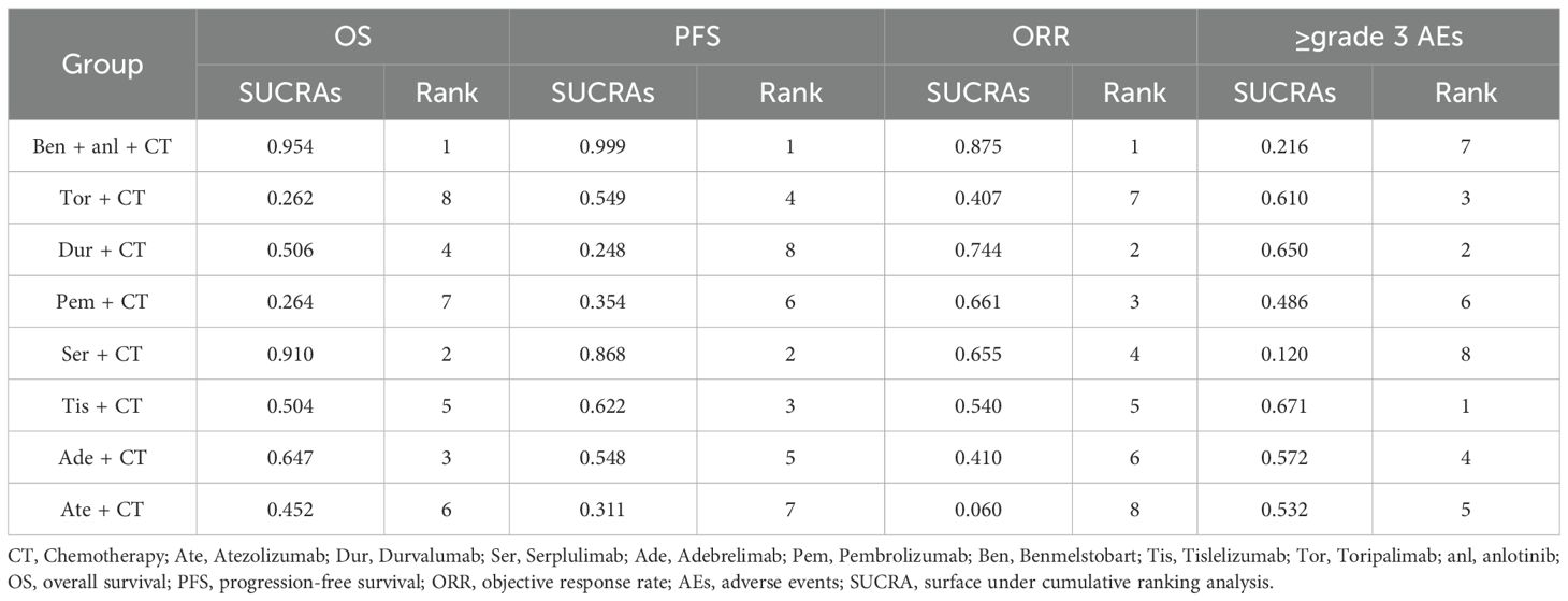 Treatment ranking probabilities were estimated using the SUCRA values across eight ICI-based regimens. For OS and PFS, the combination of chemotherapy with benmelstobart and anlotinib demonstrated the highest ranking (SUCRA 95.4% and 99.9%), followed by the combination of chemotherapy with serplulimab (SUCRA 91.0% and 86.8%). In terms of ORR, the combination of chemotherapy with benmelstobart and anlotinib also ranked first (SUCRA 87.5%), followed by the combination of chemotherapy with durvalumab (SUCRA 74.4%). Regarding safety, the tislelizumab- and durvalumab-based regimens exhibited the most favorable profiles, with SUCRA values of 67.1% and 65.0% for the lowest incidence of ≥grade 3 AEs, while the benmelstobart- and serplulimab-based regimens showed higher toxicity. The detailed results are listed in Table 1.