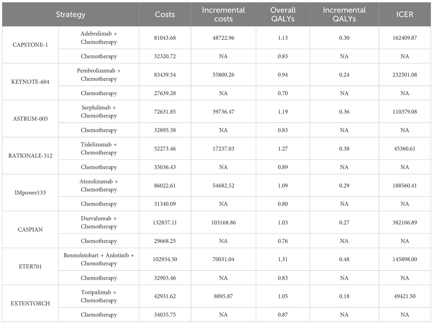 Data were extracted from the OS and PFS curves of RCTs using the GetData Graph Digitizer (version 2.26; https://getdata-graph-digitizer.com). The extracted data were subsequently refined to ensure that survival rates remained stable or declined over time, thereby eliminating any implausible upward trends. The processed data were then arranged into two datasets: one containing the number of risk events over time, and the other containing survival rates corresponding to specific time points for OS or PFS. Individual patient data were reconstructed using the R package ‘digitise,’ following an approach consistent with the established Guyot method for survival data reconstruction. Based on the reconstructed individual patient data, Kaplan–Meier curves were generated using the R package ‘survminer’ (Supplementary Figure S1 and S2). Subsequently, parametric survival models were developed and evaluated to project long-term outcomes, allowing extrapolation of survival data over a 10-year horizon for the cost-effectiveness analysis. In parametric model construction, log-logistic distribution was selected as the best-fitting parameter model based on Akaike information criterion (AIC) and Bayesian information criterion (BIC) (Supplementary Figures S3, S4; Supplementary Table S5) (26). The log-logistic distribution was selected as the preferred model for survival extrapolation, as it achieved the lowest AIC and BIC values in most trials. It provided the best fit for OS in CAPSTONE-1, ASTRUM-005, RATIONALE-312, and EXTENTORCH, while in KEYNOTE-604 and ETER701 some survival curves also favored the log-logistic distribution. In IMpower133 and CASPIAN, although alternative models produced slightly lower AIC/BIC values, the differences from the log-logistic model were marginal (≤19), indicating no statistically meaningful superiority of alternative models. Therefore, the log-logistic distribution was applied as a unified model to ensure methodological consistency and comparability across analyses. The shape (γ) and scale (λ) parameters of the log-logistic distribution were estimated using the R software (Supplementary Table S6). Health state indices were derived from the EQ-5D-5L user guide, where 0.70, 0.6, and 0 indicated PFS, PD, and death, respectively (27). This cost-effectiveness analysis was conducted from the perspective of the Chinese healthcare system, and therefore only direct medical costs were considered, including drug acquisition, AE management, follow-up testing, subsequent therapy, and best supportive care (BSC). The direct medical costs of drug acquisition were acquired from the local database (https://www.pharnexcloud.com/). Drug administration schedules in the cost-effectiveness analysis were aligned with those reported in the clinical trials (9–16). For agents with dosing based on body weight or body surface area, we assumed a representative patient with an average body weight of 64 kg, a body surface area of 1.72 m² (28) and a creatinine clearance of 80 mL/min (29). For AE management, follow‐up testing, subsequent therapy, and BSC, cost inputs were obtained from literature data (30, 31). The related cost breakdowns and their references are provided in Supplementary Table S7. All costs were converted to US dollars (1 USD = 7.23 RMB, March 2025).