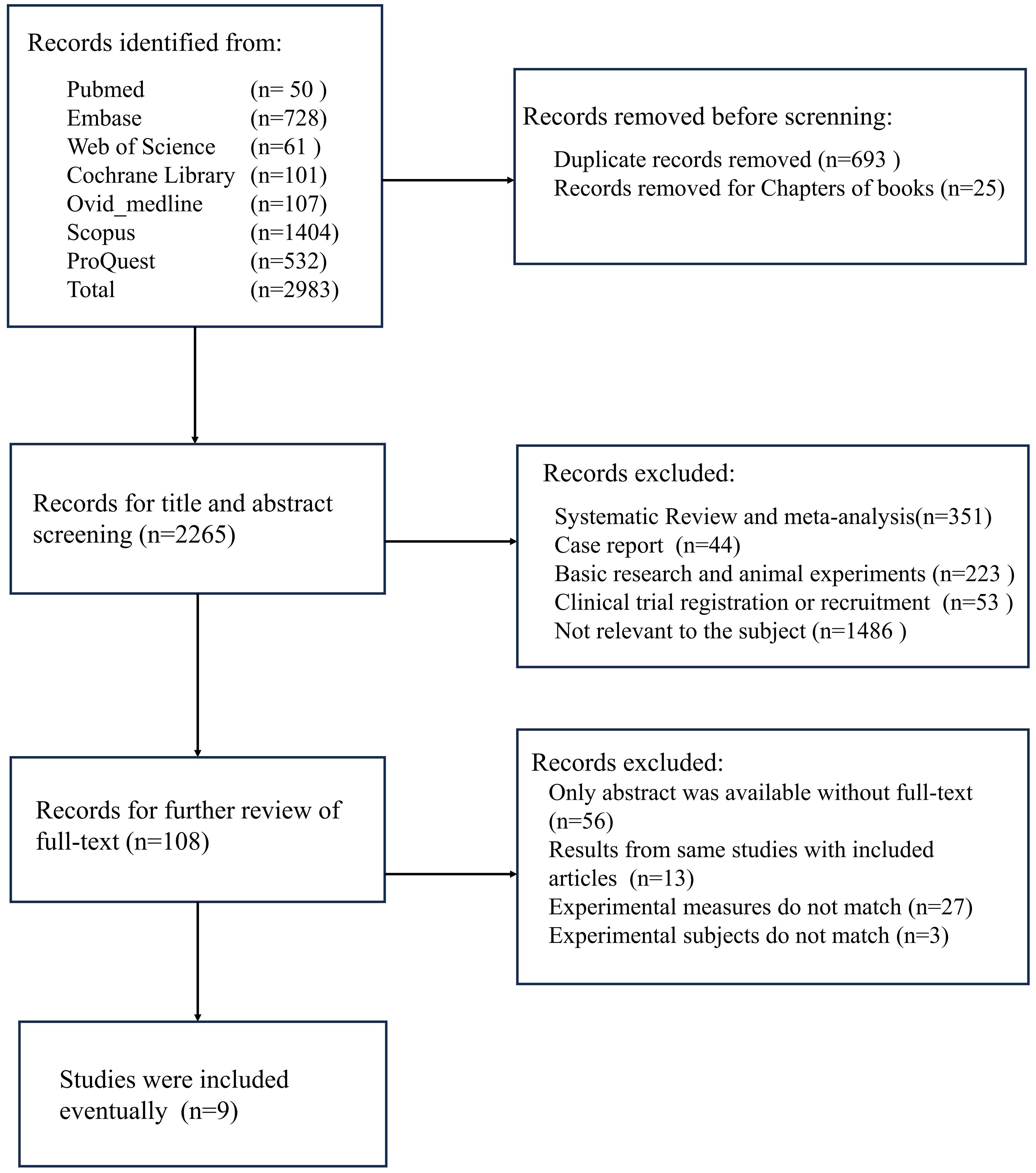 A comprehensive search was conducted for this study, encompassing seven major databases, which resulted in a total of 2,938 documents being reviewed. Following the exclusion of duplicate studies and book chapters, the number of documents was reduced to 2,265. Following a thorough examination of the titles and abstracts, a total of 351 systematic reviews and meta-analyses, 44 case reports, 223 basic research papers, 53 clinical trial recruitment or registration information, and 1,486 papers unrelated to the research topic were excluded. Following an exhaustive evaluation of the full texts, 56 studies were excluded due to the unavailability of full text, 13 studies were excluded as they were duplicate reports, 27 studies were excluded for failing to correspond with the study’s theme, and 3 studies were excluded due to inconsistencies in primary outcome measures, rendering meta-analysis unfeasible. A total of 9 studies were incorporated into this meta-analysis (Figure 1).