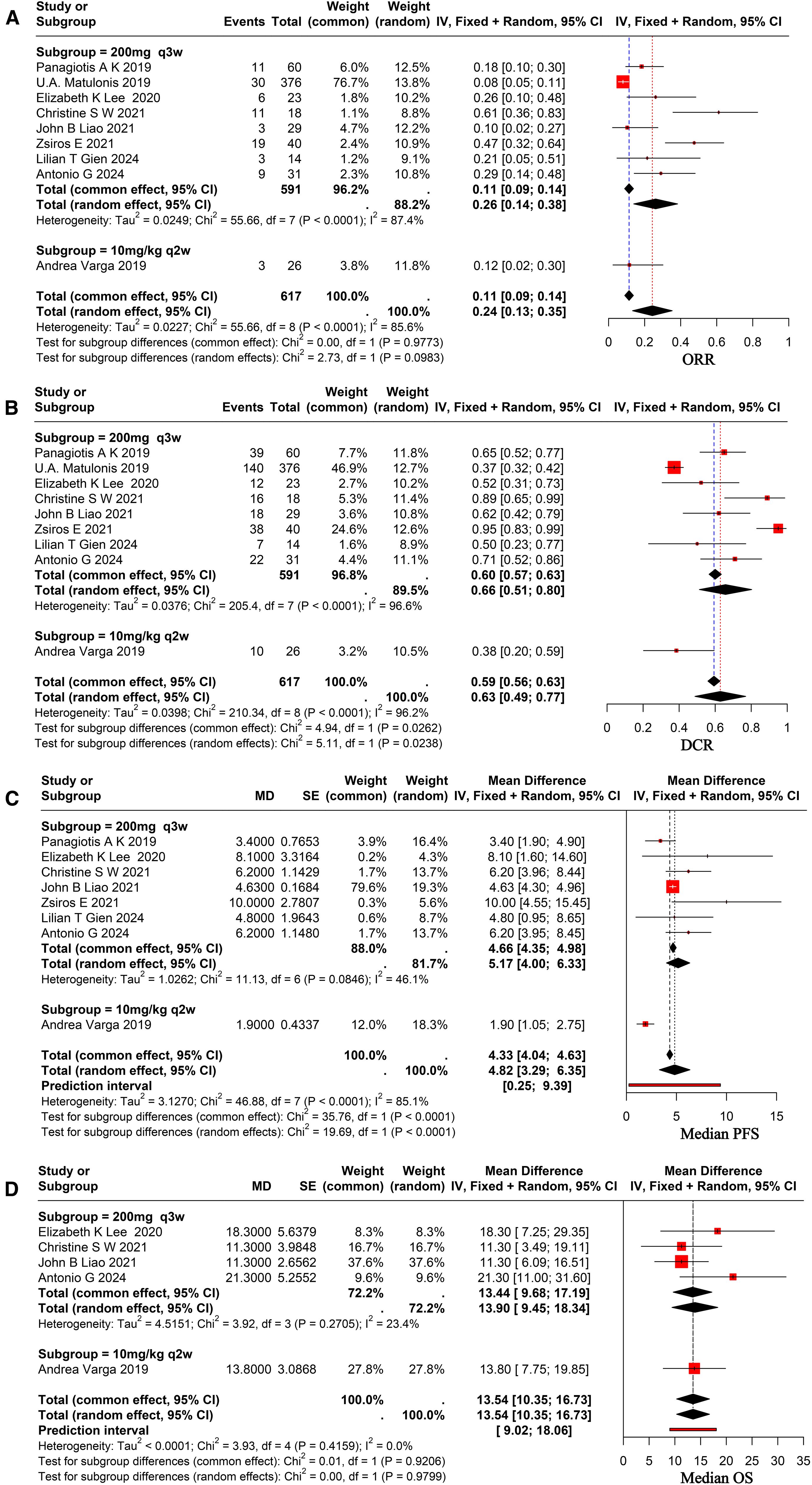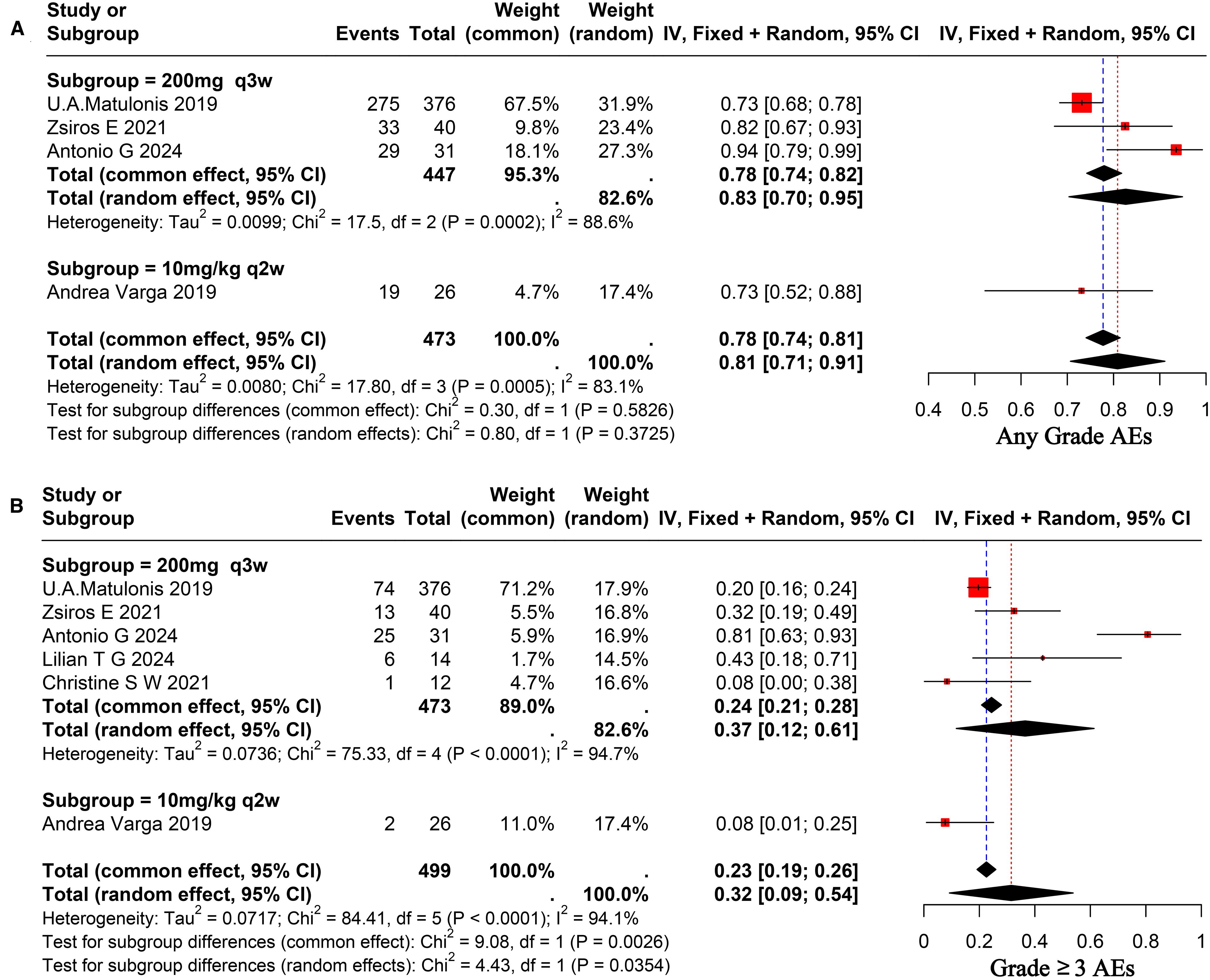 Subgroup analysis results based on different dosing regimens showed that the subgroup receiving 200 mg q3w demonstrated significantly superior outcomes in terms of ORR and mPFS compared to the subgroup receiving 10 mg/kg q2w (p < 0.05). However, no statistically significant difference was observed between the two groups in terms of DCR and mOS (p > 0.05). With regard to the safety assessment, no statistically significant differences were observed in the probability of any grade AEs occurring between the two groups (p > 0.05). However, the probability of occurrence of ≥3-grade AEs was significantly lower in the subgroup receiving a dose of 10 mg/kg q2w compared to the subgroup receiving a dose of 200 mg q3w. The findings indicate that, regarding short-term efficacy, the group administered a dose of 200 mg q3s may outperform the group receiving a dose of 10 mg/kg q2w. In terms of long-term efficacy, no significant difference was observed between the two groups. In the context of severe AEs, individualized dosing may be more advantageous than standardized dosing. Further high-quality RCTs are necessary to validate these findings.