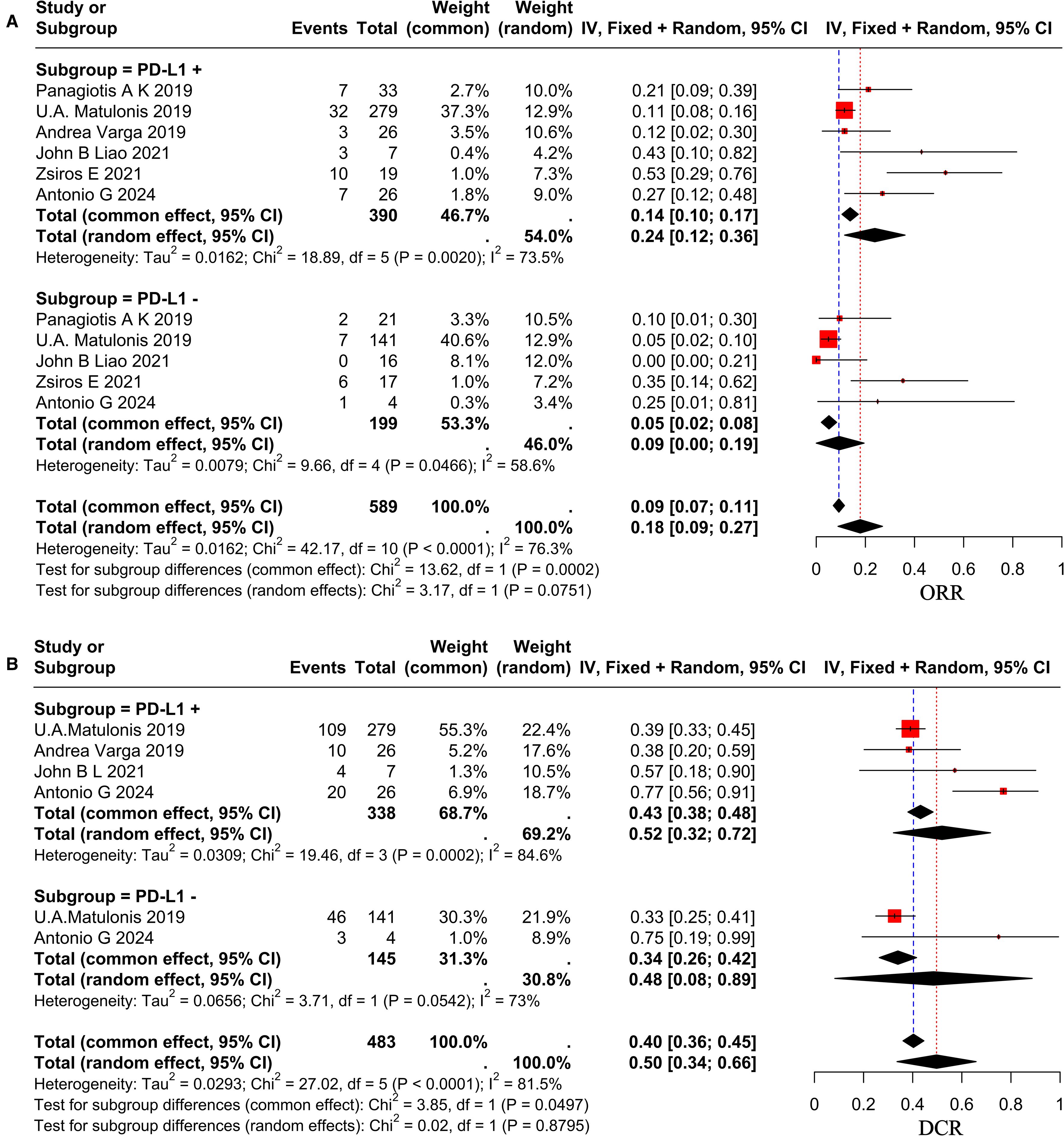 Figure 3. Forest plot showing subgroup analysis of ORR (A) and DCR (B) in different PD-L1 status group.