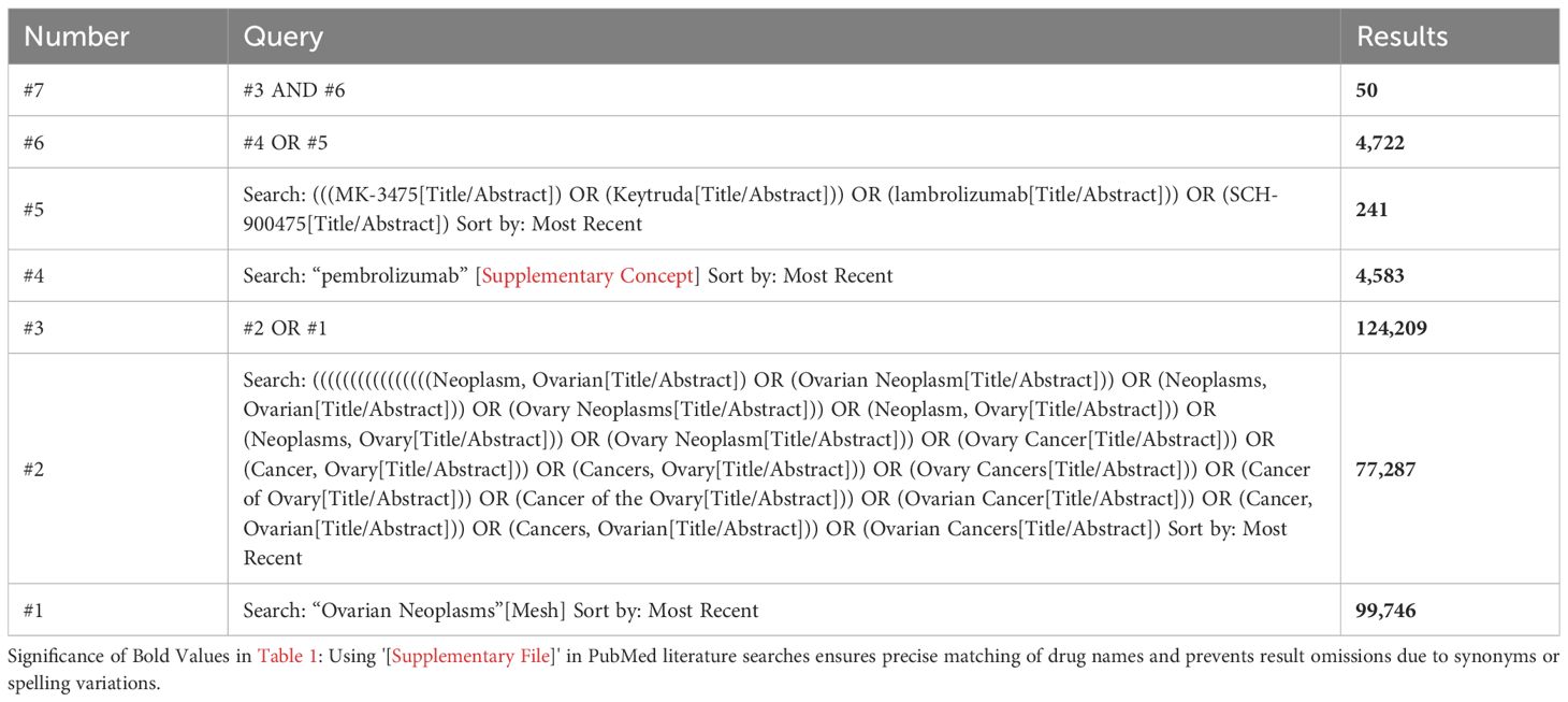 A comprehensive search of the extant literature was conducted, encompassing publications up to November 18, 2024, in the following databases: PubMed, Embase, Web of Science, Cochrane Library, Ovid_medline, Scopus, and ProQuest. The meta-analysis did not impose any language restrictions. The subject terms employed in the PubMed database were “Ovarian Neoplasms” [Mesh] and “pembrolizumab” [Supplementary Concept]. The detailed search strategy can be seen in Table 1.