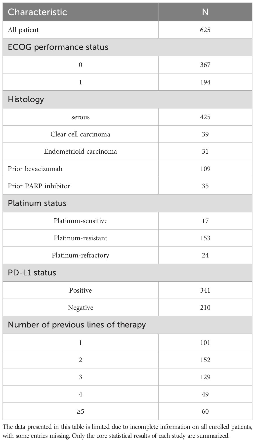 Aggregate analysis of baseline characteristics across included studies determined that patient age ranged from 25 to 89 years. The majority of patients exhibited an Eastern Cooperative Oncology Group (ECOG) performance status of 0 (n=367) or 1 (n=194). Serous carcinoma represented the predominant histological subtype (n=425). Evaluation of programmed death-ligand 1 (PD-L1) expression status demonstrated that 341 patients tested positive, while 210 tested negative. Baseline characteristics of all enrolled patients are summarized in Table 2, with study-specific features detailed in Table 3.