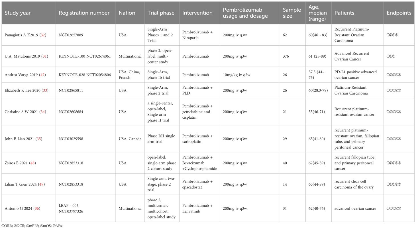 This meta-analysis included nine studies conducted in the United States, Greece, China, France, and Canada. All studies were prospective trials, comprising eight single-arm clinical trials and one non-randomized controlled trial. Due to the advanced recurrent OC present in all patients of this non-randomized controlled trial (31) and the uniformity of the intervention, the two cohorts from this study were amalgamated to satisfy the inclusion criteria for this meta-analysis. This meta-analysis comprised 625 patients in total. The efficacy assessment dataset comprised an effective sample size of 617 patients. Eight patients were excluded from the efficacy analysis due to the following reasons: In the study conducted by Panagiotis A K (32), two patients withdrew from the trial during treatment for personal reasons. In Elizabeth K Lee’s study (33), three patients discontinued the trial due to disease progression or severe allergic reactions to chemotherapy drugs after the initial treatment, resulting in incomplete efficacy follow-up. In Christine’s study (34), three patients withdrew due to complications associated with OC recurrence, preventing them from completing subsequent imaging assessments. The total number of patients eligible for meta-analysis in safety assessment datasets was 592. Panagiotis’s study (32) encompassed Phase I and Phase II cohorts, with safety data for 14 patients in the Phase I cohort deemed incomplete and therefore excluded from the meta-analysis. Safety information was fully extracted for 53 OC patients in the Phase II cohort. John B Lee’s study (35) employed a distinct method for calculating the incidence of AEs, which precluded a meta-analysis of effect sizes with the other included studies. Christine’s study (34) categorized AEs statistics into the combination therapy phase and the single-agent maintenance phase, revealing overlap between the two phases. To prevent data duplication, only the incidence of AEs from the single-agent maintenance phase was included.