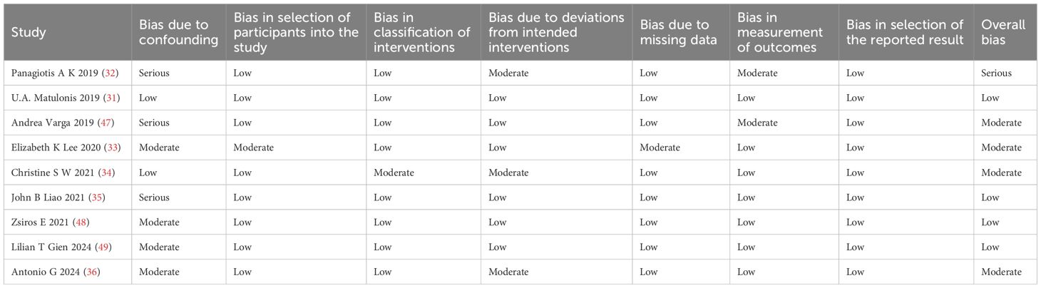 Two researchers assessed the risk of bias of 9 studies based on the ROBINS-I tool, and the Cohen’s kappa coefficient of overall bias was 0.667, which suggests that the consistency of the risk of bias assessment of the literature between the two researchers is high. To address the inconsistency of the assessment results between the two researchers, we introduced a third researcher, Tong Lin, to jointly assess the results. Table 4 displays the final results. One study was deemed to be at serious risk of bias, four at moderate risk, and four at low risk.