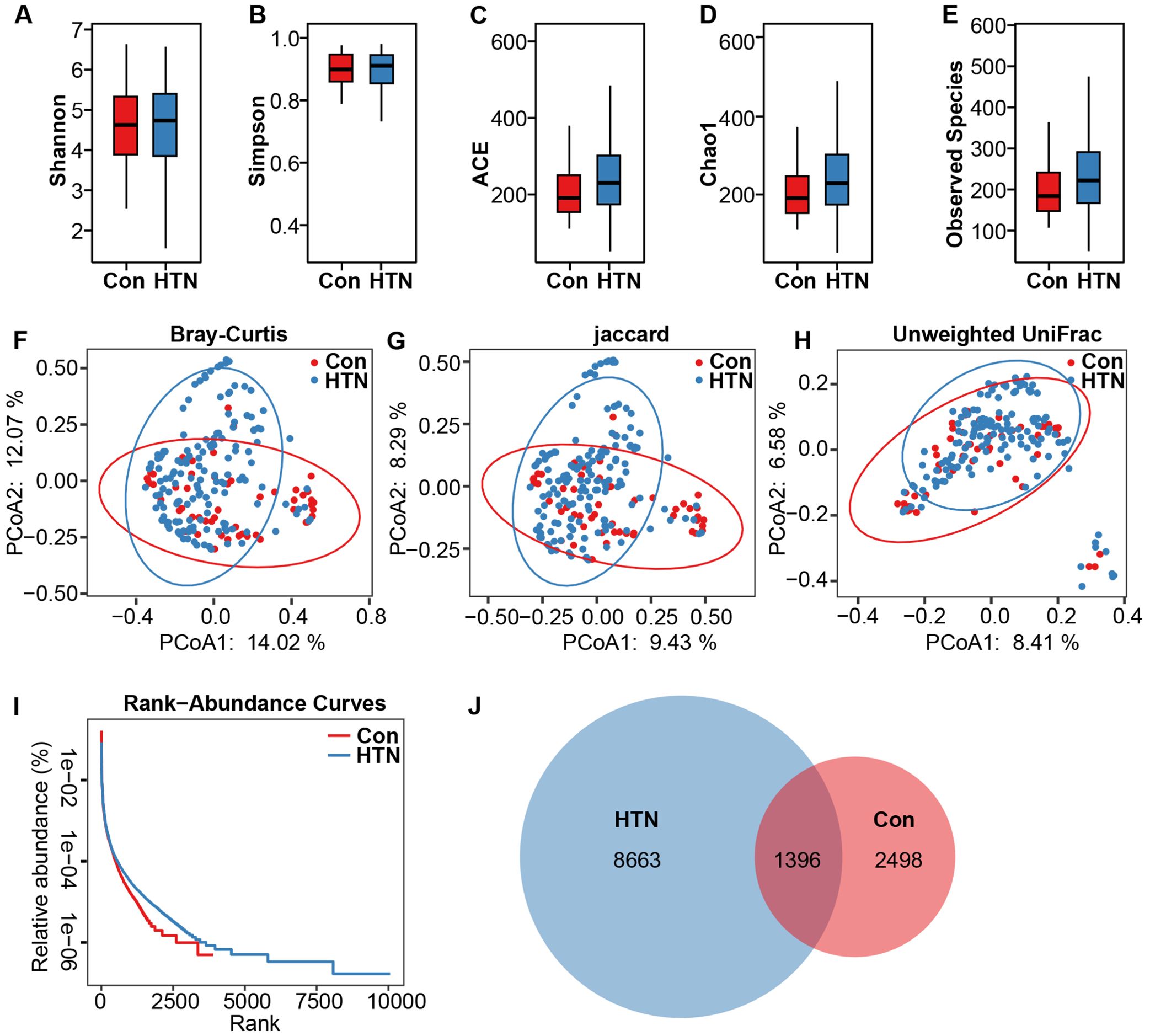 Box plots display diversity indices (Shannon, Simpson, ACE, Chao1, Observed Species) for control (Con) and hypertensive (HTN) groups. PCoA plots show microbial community differences between groups, using Bray-Curtis, Jaccard, and Unweighted UniFrac measures. The rank-abundance curve compares species abundance, and a Venn diagram depicts shared and unique species between groups, with HTN having a larger set.