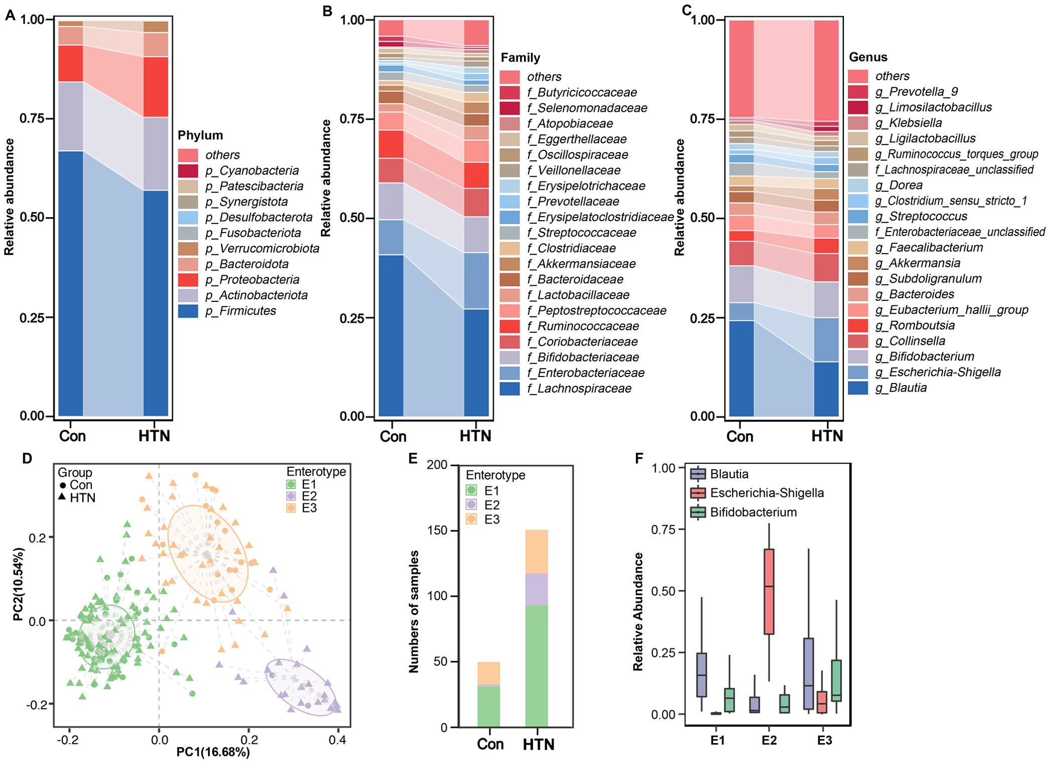 Microbiome composition data visualizations are shown across different analyses. Panels A, B, and C depict stacked bar charts of the relative abundance of microbial communities at the phylum, family, and genus levels, respectively, comparing control (Con) and hypertensive (HTN) groups. Panel D shows a principal coordinate analysis (PCoA) plot with group differences and enterotype clustering. Panel E is a bar chart showing the number of samples for each enterotype in control and hypertensive groups. Panel F features a box plot comparing the relative abundance of Blautia, Escherichia-Shigella, and Bifidobacterium across enterotypes.