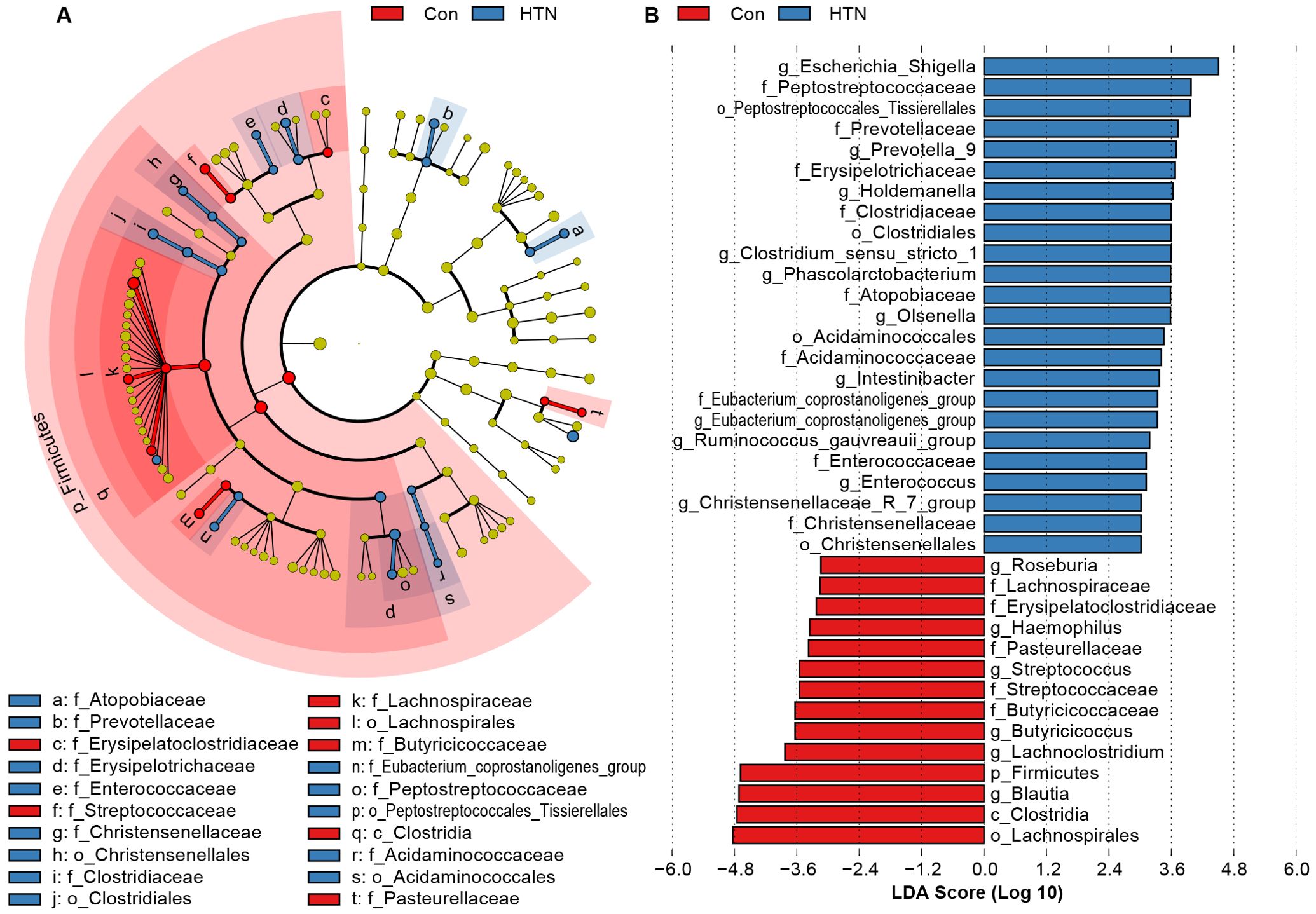 Circular phylogenetic tree (A) visualizes bacterial taxa differences, with nodes shaded red for control (Con) and blue for hypertension (HTN). Bar chart (B) shows LDA scores for taxa, highlighting differential abundance in red (Con) and blue (HTN). Labels indicate taxonomic groups with varying significance.