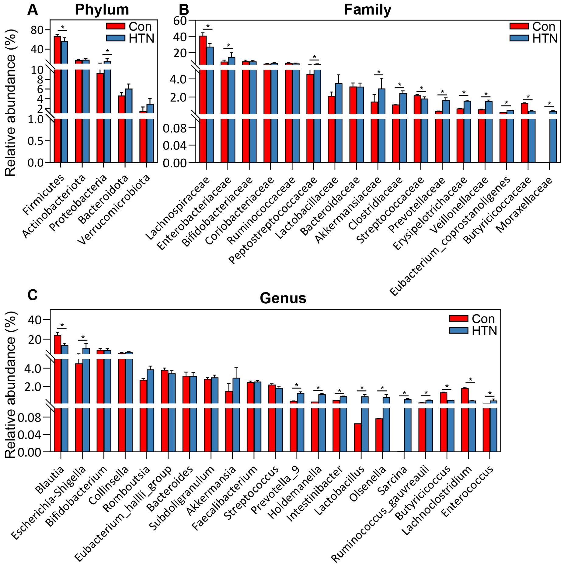 Bar charts displaying the relative abundance of microorganisms at the phylum, family, and genus levels. The groups are labeled as Con and HTN, with blue and red bars. Significant differences are marked with asterisks. Panel A shows phyla like Firmicutes and Actinobacteriota. Panel B illustrates families like Lachnospiraceae and Bifidobacteriaceae. Panel C depicts genera such as Blautia and Bifidobacterium. Error bars indicate standard deviation.