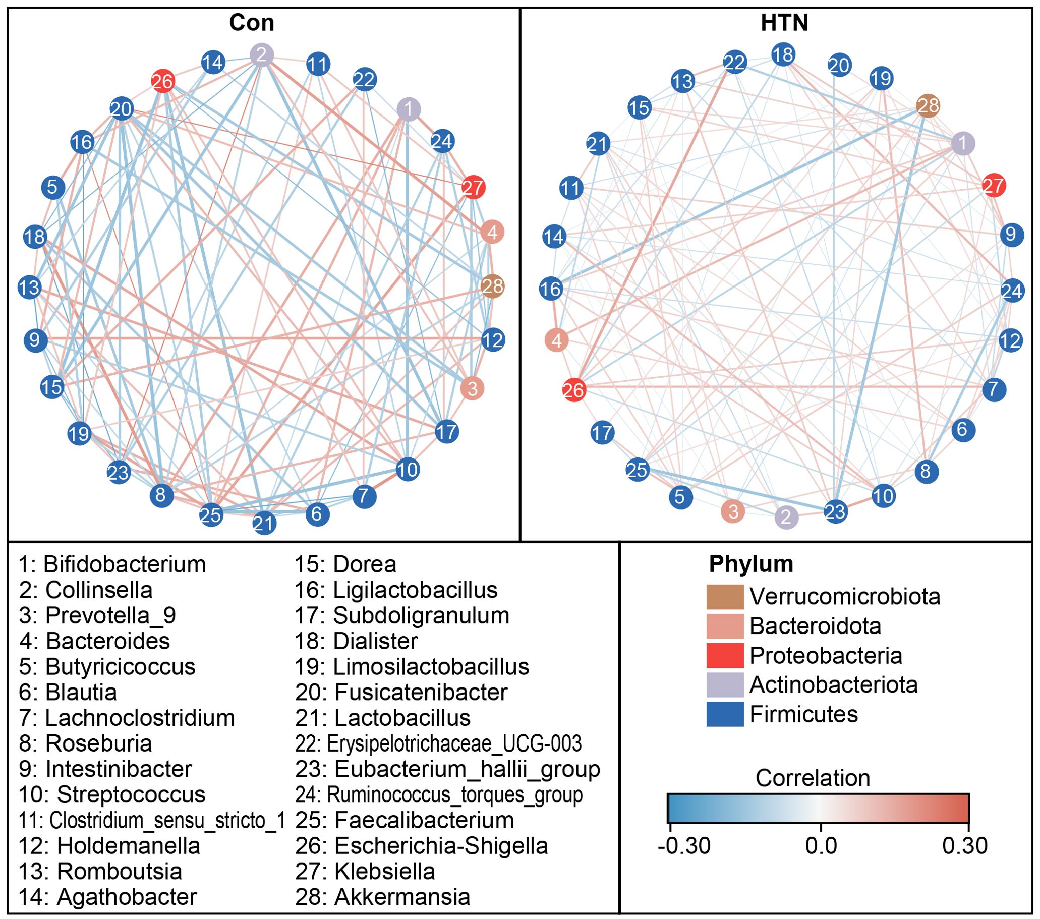 Two circular network diagrams compare the microbial community interactions in control (Con) and hypertension (HTN) groups. Each diagram contains numbered nodes representing different bacterial taxa, colored by phylum: Verrucomicrobiota, Bacteroidota, Proteobacteria, Actinobacteriota, and Firmicutes. Lines between nodes indicate correlations, with blue for negative and red for positive, scaled from -0.30 to 0.30. A legend identifies the taxa by number.