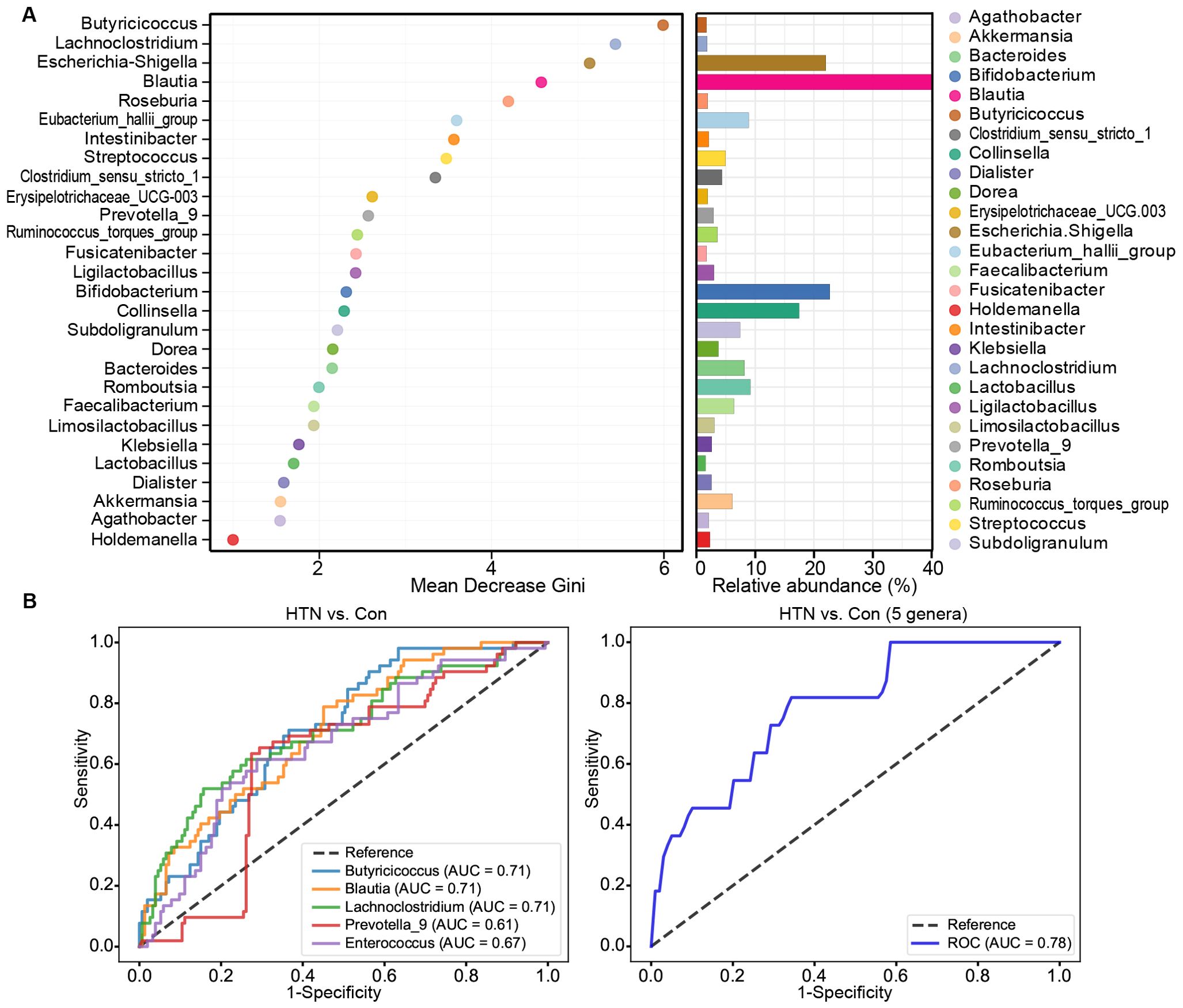 Panel A shows a dot plot and bar chart comparing microbial genera based on mean decrease Gini index and relative abundance, respectively. Panel B presents two ROC curves for HTN versus controls, with multiple genera in the left graph and five genera in the right. The left graph indicates AUC values for different genera, while the right shows an overall AUC of 0.78 for these genera combined.