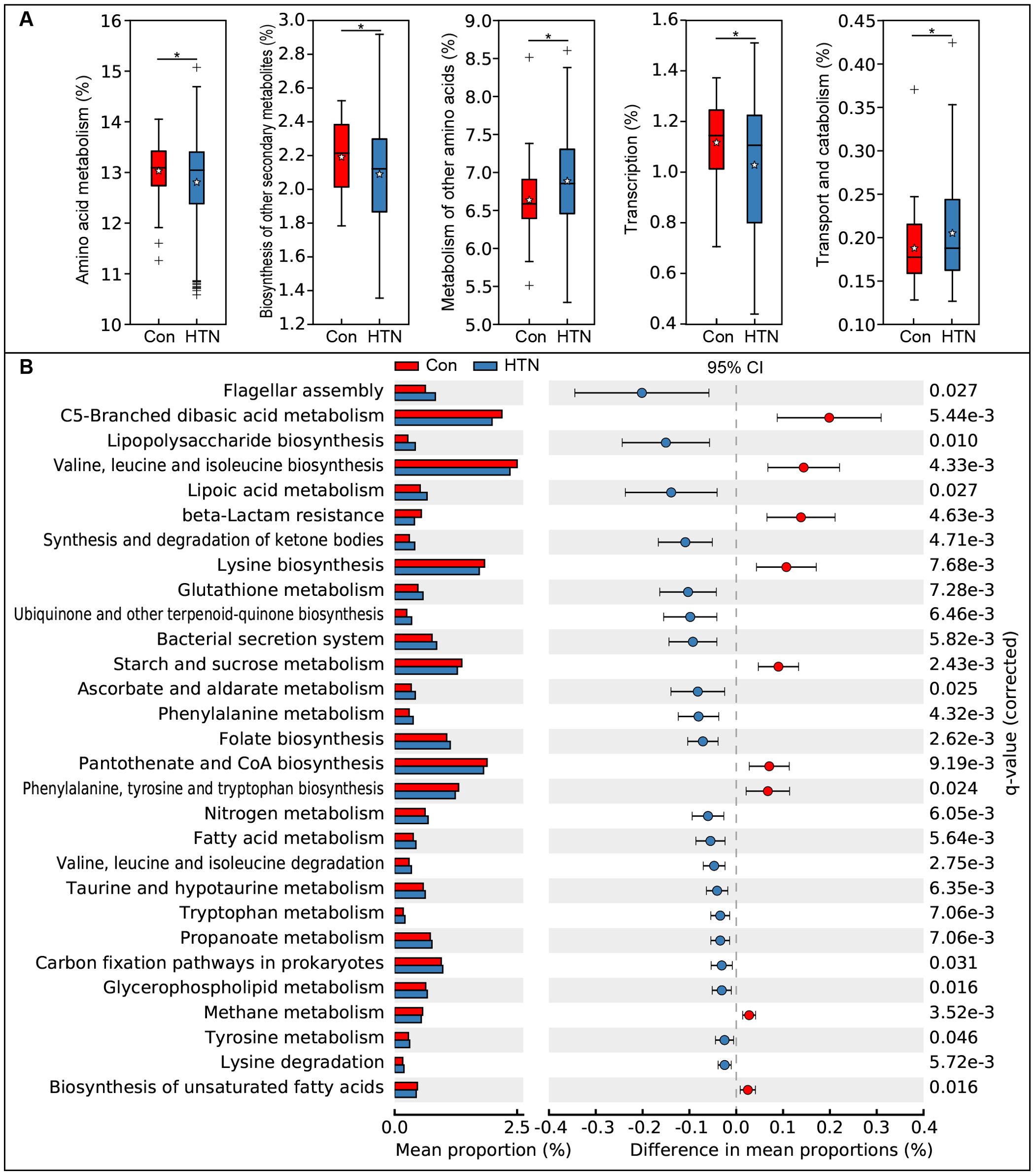 Box and whisker plots and bar graphs comparing various metabolic processes between control and hypertension groups. Part A contains box plots showing significant differences in amino acid metabolism, biosynthesis of secondary metabolites, metabolism of other amino acids, transcription, and transport and catabolism. Part B displays bar graphs with error bars for numerous metabolic pathways, indicating the mean proportion and difference in mean proportions. Significance levels are marked, and data are categorized by 95% confidence intervals and q-values.