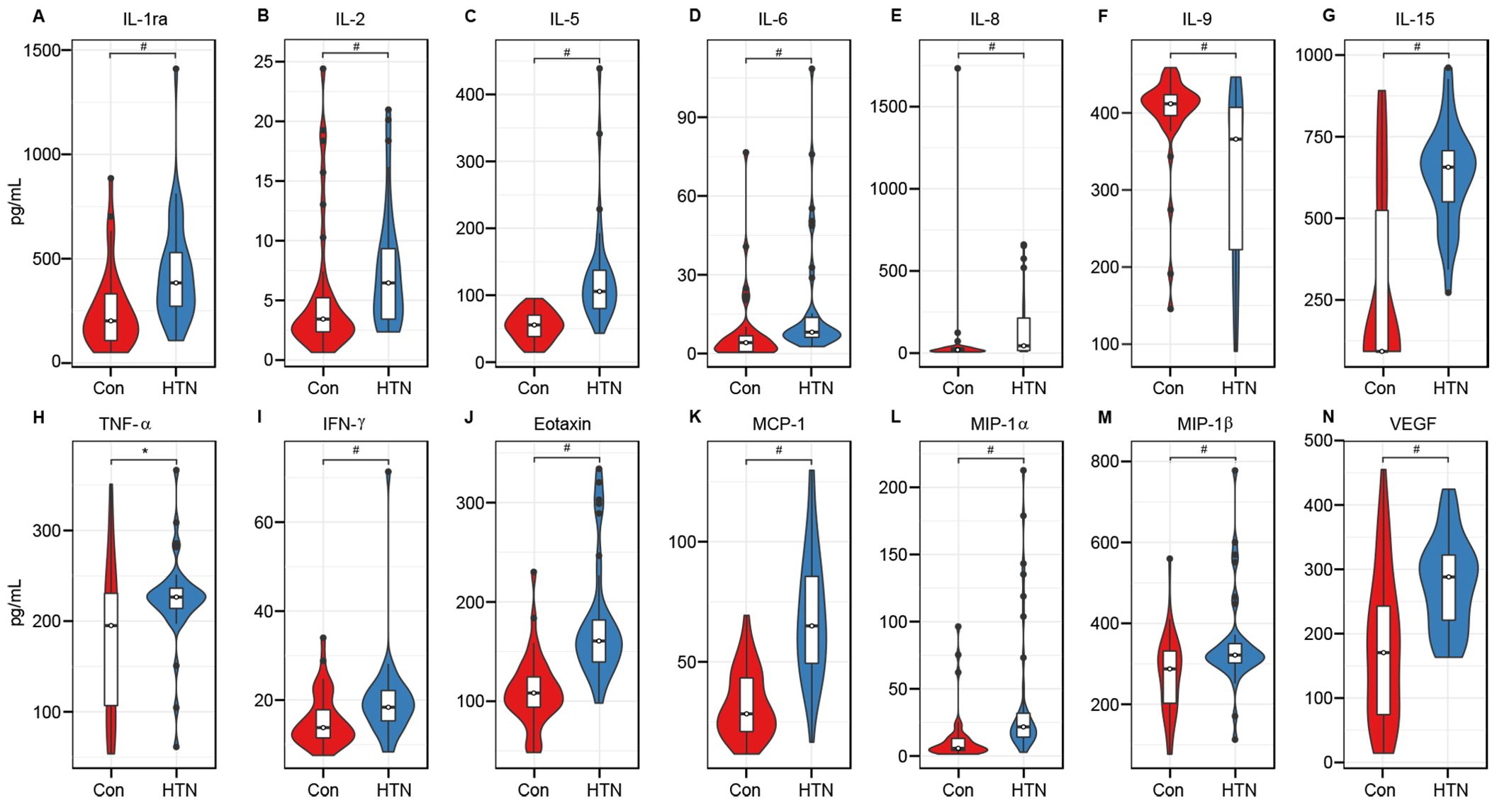 Violin plots display the expression levels of various cytokines, comparing control (Con) and hypertensive (HTN) groups. Each subplot represents a different cytokine with measured values in picograms per milliliter (pg/mL). The plots include: IL-1ra, IL-2, IL-5, IL-6, IL-8, IL-9, IL-15, TNF-α, IFN-γ, Eotaxin, MCP-1, MIP-1α, MIP-1β, and VEGF. Significant differences are indicated by symbols such as “#” and “*”.