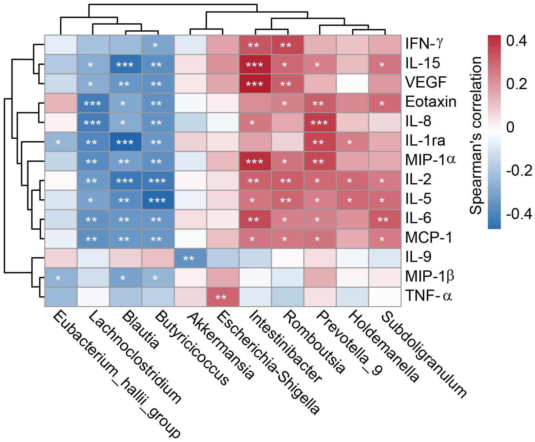 Heatmap of Spearman's correlation between various bacterial genera and cytokines, colored from blue to red indicating correlation from -0.4 to 0.4. Significant correlations are marked with asterisks. Hierarchical clustering is shown on the left and top.