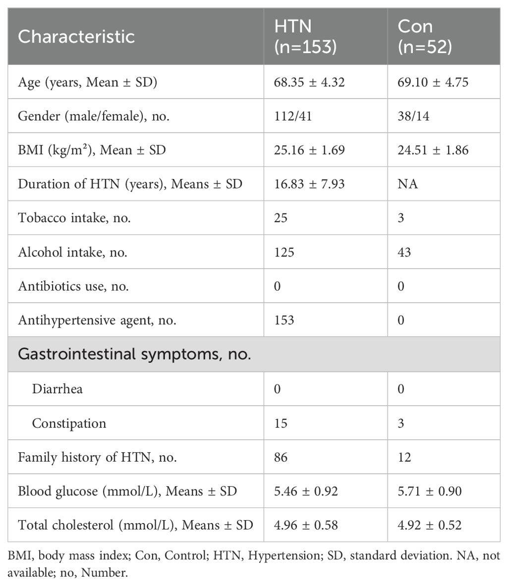 A total of 153 HTN patients (aged 61–76 years) and 52 age- and gender-matched healthy controls with normal BP were recruited from Lishui, China, between May and August 2024. The study was approved by the ethics committee of Lishui Second People’s Hospital (reference no. 20230119-01), and all participants provided written informed consent prior to inclusion. Hypertension was diagnosed according to the following criteria: systolic blood pressure (SBP) ≥140 mmHg or diastolic blood pressure (DBP) ≥90 mmHg, confirmed either through repeated examinations (41) or the use of antihypertensive medication. BP measurements were taken with participants seated, conducted by trained nurses. Three readings were recorded at 5-minute intervals using a random-zero mercury column sphygmomanometer, and the average of these readings was considered the final measurement. Exclusion criteria for the study included: age <60 years, body mass index (BMI) >28 kg/m², acute respiratory or intestinal infections, cancer, stroke, peripheral artery disease, heart failure, diabetes, intestinal surgery, inflammatory bowel disease, diarrhea, chronic pancreatitis, elevated body temperature, high white blood cell count, and the use of antibiotics, prebiotics, probiotics, symbiotics, or immunosuppressive drugs within the past month.