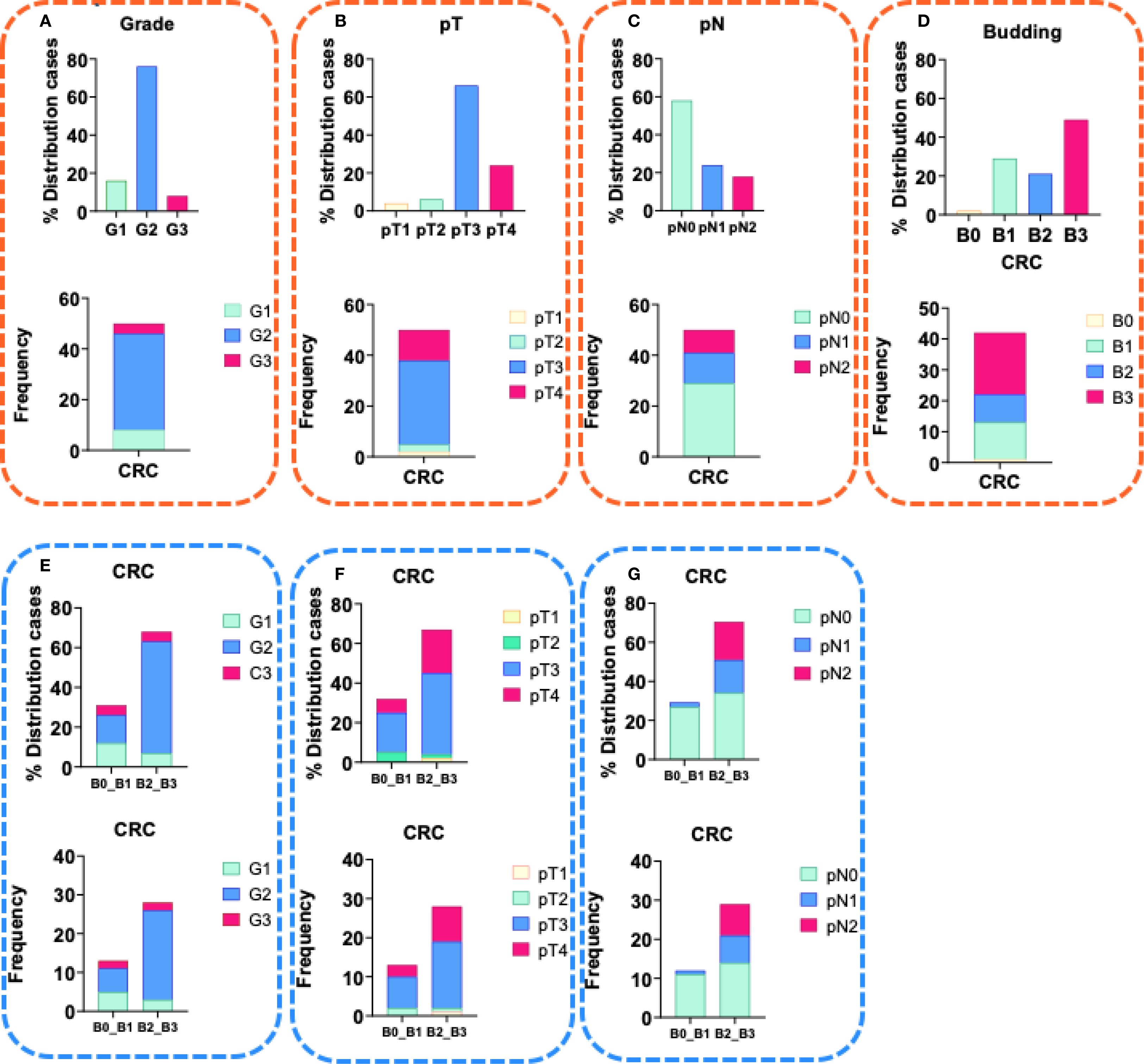 Figure 1. Characteristics of CRC patients. (A) Distribution (%) and frequency of CRC patients with tumor grade of differentiation G1- well-differentiated tumor, G2- moderately differentiated tumor and G3- poorly differentiated tumor, in the study group; (B) Distribution (%) and frequency of CRC patients with tumor size pT1, pT2, pT3 and pT4 within the study group; (C) Distribution (%) and frequency of CRC patients with invasion in the lymph nodes pN0, pN1and pN2 within the study group; (D) Distribution (%) and frequency of CRC patients with tumor budding B0, B1, B2 and B3 within the study group; (E) Distribution (%) and frequency of CRC patients with tumor grade of differentiation G1- well-differentiated tumor, G2- moderately differentiated tumor and G3- poorly differentiated tumor, in group with budding B0+B1 and in group with budding B2+B3; (F) Distribution (%) and frequency of CRC patients with tumor size pT1, pT2, pT3 and pT4 within the study group; (G) Distribution (%) and frequency of CRC patients with invasion in the lymph nodes pN0, pN1and pN2 within the study group.