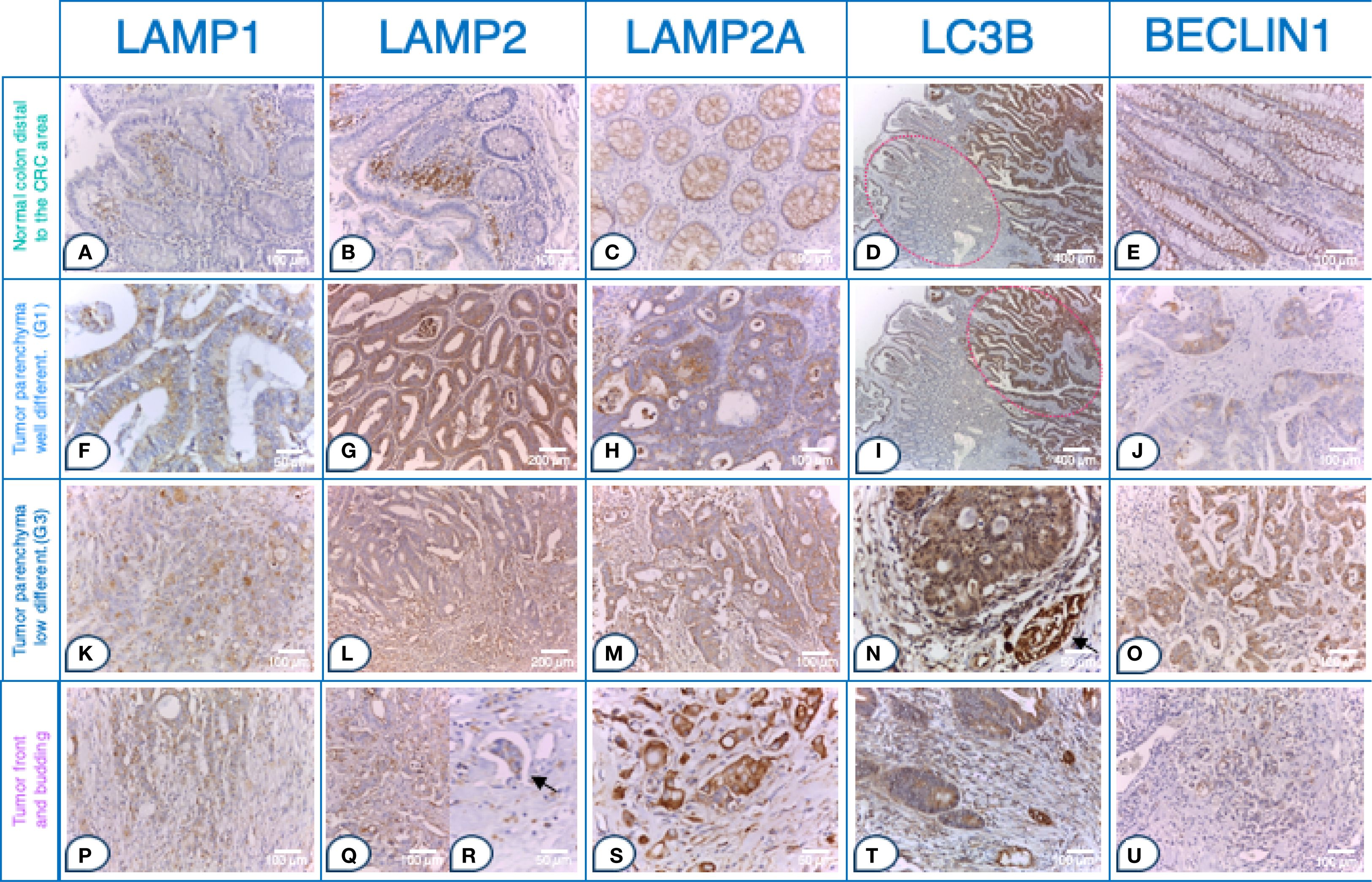 Figure 2. Strong LAMP and autophagy markers expression in tumor buds within the front of tumor invasion in CRC. Tissue sections. Normal colon distal to the CRC area a- e: (A) Glandular parenchyma 0; stroma 2+ in the upper 1/3 of the mucosal chorion. Immunohistochemistry (IHC), anti-LAMP1, x200 (original magnification); (B) Glands 1 +. IHC, anti- LAMP2, x200 (original magnification); (C) Expression 1 +. IHC, anti- LAMP2A, x200 (original magnification); (D) Left side of the microphotograph, tumor parenchyma 1+, stroma 3+ IHC, anti- LC3B, x50 (original magnification); (E) Expression 2 +. IHC, anti- BECLIN1, x200 (original magnification); Tumor parenchyma in well-differentiated adenocarcinoma (G1) f-j: (F) Tumor parenchyma predominantly apical cytoplasmic signal 2+; (IHC), anti-LAMP1, x400 (original magnification); (G) Tumor parenchyma 2+, stroma 2 +. IHC, anti- LAMP2, x100 (original magnification); (H) In the tumor cells of tumor parenchyma 2 +. IHC, anti- LAMP2A, x200 (original magnification); (I) Right side of the microphotograph, tumor parenchyma 2+, stroma 3+ IHC, anti- LC3B, x200 (original magnification); (J) In the tumor cells of tumor parenchyma 2+ with expression enhanced (accentuated) around the lumen of the tumor glands. IHC, anti- BECLIN1, x200 (original magnification) Tumor parenchyma in poorly differentiated adenocarcinoma (G3) (K–O): (K) Tumor parenchyma with marked diffuse cytoplasmic expression 3 +. (IHC), anti-LAMP1, x200 (original magnification); (l) Tumor parenchyma (top) and tumor front (bottom) with clearly visible expression gradient, with more pronounced expression; expression also in the stroma around the tumor front zone in the form of vacuoles and diffusely. IHC, anti- LAMP2, x100 (original magnification); (M) In the tumor cells of the tumor parenchyma 2 +. IHC, anti- LAMP2A, x200 (original magnification); (N) Tumor parenchyma and stroma 3+ & internal positive normal colon with a nerve fiber 3+ (arrow). IHC, anti- LC3B, x400 (original magnification); (O) 3+ expression in tumor cells from the tumor parenchyma, with expression enhanced (accentuated) around the nucleus but diffuse in nature. IHC, anti- BECLIN1, x200 (original magnification). Tumor front and budding p-u: (P) Tumor front (middle) with marked diffuse cytoplasmic 3+ expression and surrounding stroma with 3 +. (IHC), anti-LAMP1, x200 (original magnification); (Q) Tumor front (Budd 3) with more pronounced expression in tumor cells. IHC, anti- LAMP2, x200 (original magnification); (R) Pronounced expression 3+ in tumor embolus (arrow). IHC, anti- LAMP2, x400 (original magnification); (S) 3+ expression in the tumor cells of the tumor front. IHC, anti- LAMP2A, x400 (original magnification); (T) Tumor front 3 +. IHC, anti- LC3B, x200 (original magnification); (U) In the tumor front area of the above case (O), the expression decreases; expression 1+ in the tumor front area. IHC, anti- BECLIN1, x200 (original magnification); LAMP1, LAMP2, LAMP2A, LC3B and BECLIN1 expression levels in tumor parenchyma, stroma and front are assessed on adenocarcinomatous cells (cytokeratin 20+/cytokeratin 7-/CDX2+ markers).
