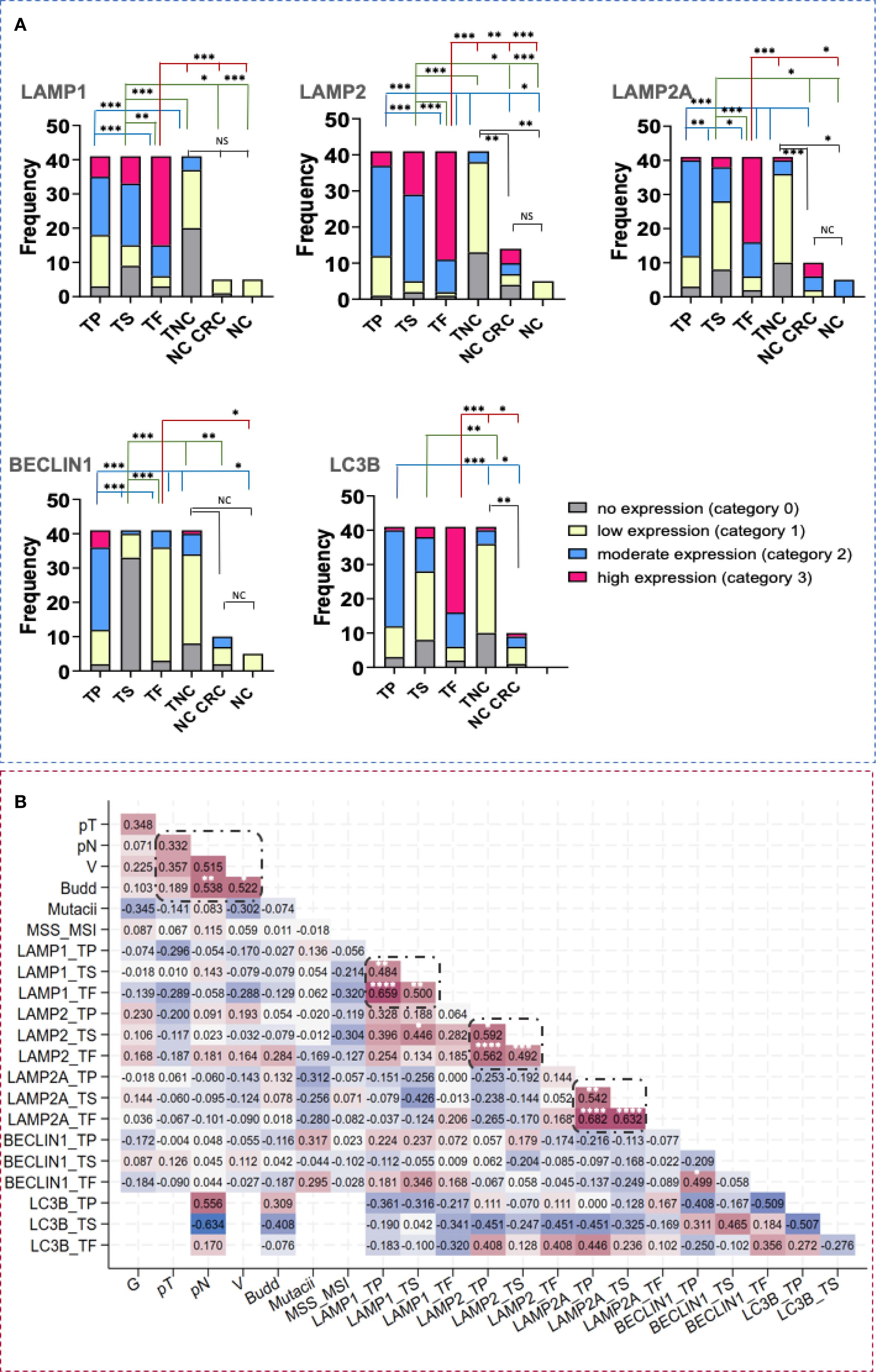 Figure 3. LAMP1, LAMP2, LAMP2A, BECLIN1 and LC3B tissue expression in CRC and healthy individuals. (A) Difference in the intensity of LAMP1, LAMP2, LAMP2A, BECLIN1 and LC3B expression in tumor parenchyma, stroma and front in CRC and in normal colon. Statistical significative differences of the protein expression levels in the tumor parenchyma and in the tumor stroma relative to the tumor front and negative controls, respectively. Expression levels were categorized into four groups (category 0- no expression, 1- low expression, 2- moderate expression, 3- high expression) in the tissue regions analyzed: (TP- tumor parenchyma; TS- tumor stroma; TF- tumor front; TNC- normal colon tissue in the CRC area; NC CRC- normal colon distal to the CRC area; NC- normal colon from nontumorous patients). Fisher-Freeman-Halton test. Differences are statistically significant with a Benjamini-Hochberg corrected p value (* p< 0,05; ** p< 0,01; *** p< 0,001; not significant (NS), p> 0.05). For exact uncorrected and corrected p-values, see Supplementary Table S1, a); (B) Kendall`s tau correlation matrix between LAMP1, LAMP2, LAMP2A, BECLIN1 and LC3B tissue expression, budding and other clinical variables. G, histological grade; pT, tumor stage; pN, invasion in lymph nodes; L, invasion in lymphatics; V, invasion in blood vessels; MSS/MSI, microsatellite stability/microsatellite instability; TP, tumor parenchyma; TS, tumor stroma; TF, tumor front. *Correlation is statistically significant with a Benjamini-Hochberg corrected p value <0.05. For exact uncorrected and corrected p-values, see Supplementary Table S1b); The colors span from dark blue to dark red, where dark blue denotes a r value of - 1, and dark red indicates a r value of 1.