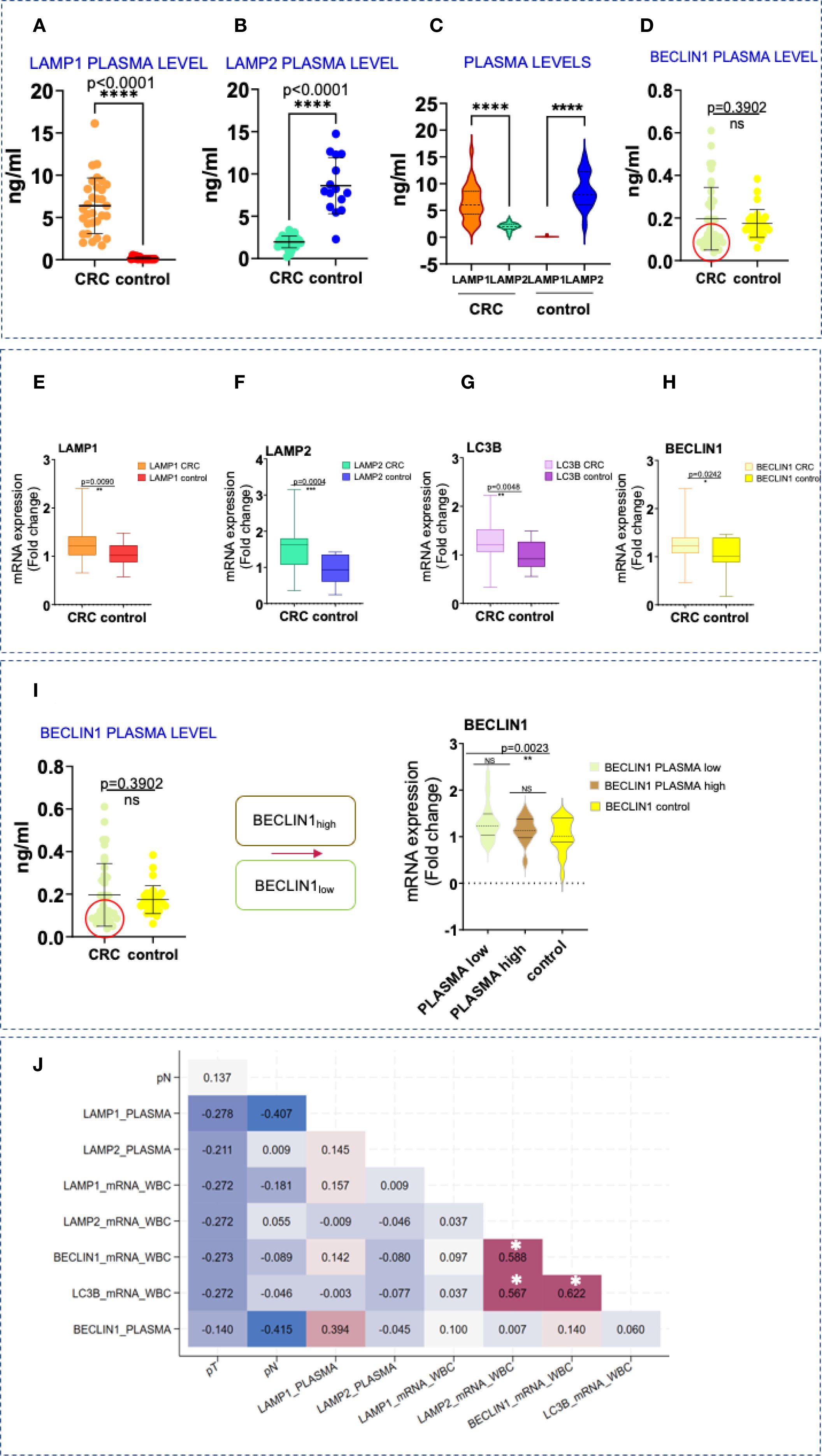 Figure 4. Protein and gene expression levels of LAMPs and autophagy markers in blood samples. (A-D) Difference in the secretory plasma circulating form of LAMP1, LAMP2, and BECLIN1 in CRC and in healthy patients. Statistical significative differences of the protein plasma levels in the CRC blood samples relative to the healthy controls, respectively. Statistically significative differences were calculated by t-test with Welch`s correction, ****p<0,0001; not significant (ns), p> 0.05. (E–H) LAMP1, LAMP2, BECLIN1 and LC3B overexpression in CRC. qPCR analysis of LAMP1, LAMP2, BECLIN1 and LC3B mRNA levels in WBC in CRC and healthy donors. Data are shown as mean ± SD. Statistically significative differences were calculated by t-test. p value (*p< 0,05; **p<0,001; ***p< 0,0001; ****p<0,0001). (I) Тwo subcategories, with lower levels of BECLIN1 (within the red circle) and higher- above. BECLIN1low plasma concentrations are associated with CRC patients displaying elevated transcript levels in WBCs (the figure on the right- t-test with Welch`s correction, box plot analysis). (J) Kendall`s tau rank correlation matrix between LAMP1, LAMP2, BECLIN1 and LC3B plasma protein and gene expression levels in WBC and other clinical variables. pT, tumor stage; pN, invasion in lymph nodes; *Correlation is statistically significant with a Benjamini-Hochberg corrected p value < 0.05. For exact uncorrected and corrected p-values, see Supplementary Table S1c); The colors span from dark blue to dark red, where dark blue denotes a r value of - 1, and dark red indicates a r value of 1.