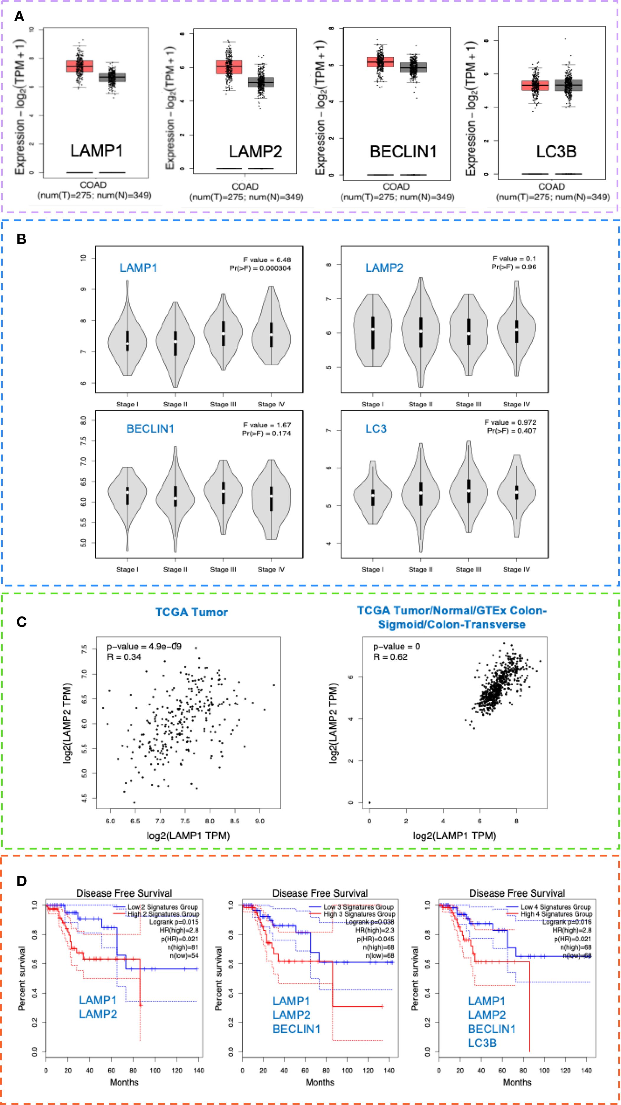 Figure 5. LAMP and autophagy signatures as potential markers of invasiveness in CRC and their prognostic significance. (A) LAMP1, LAMP2, BECLIN1 and LC3B tissue expression in CRC and healthy individuals. Box plot analysis of LAMP1, LAMP2, BECLIN1 and LC3B mRNA levels in tissues in CRC TCGA COAD tumor and TCGA COAD normal and GTEx normal data, using the GEPIA 2 data platform-Copyright © 2018 Zhang’s Lab. For the gene expression profile were considered: Differential Method ANOVA; ILog2FCI Cutoff 1, q-value Cutoff: 0.0. (B) CRC stage distribution (I-IV) of LAMP1, LAMP2, BECLIN1 and LC3B in the TCGA data COAD tumor, using the GEPIA 2 data platform - Copyright © 2018 Zhang’s Lab. (C) Correlation analysis of LAMP1 and LAMP2 gene signatures in the TCGA data COAD tumor (left, r=0.34, p=4.9e-09) and in the TCGA Tumor/Normal and the GTEx data for the colon-sigmoid/transverse sections (right, r=0.62, p=0), using the GEPIA 2 data platform - Copyright © 2018 Zhang’s Lab. Pearson correlation coefficient was calculated using the expression data sets derived from TCGA COAD tumor (n=275), TCGA COAD normal (n=41), as well as GTEx colon sigmoid and colon transverse (n=308). (D) Cancer-specific survival analysis in the context of LAMP1, LAMP2, BECLIN1 and LC3B expression in patients with CRC (TCGA). Kaplan-Meier analysis was performed, comparing TCGA-COAD patients with high 75% Cutoff and patients with low 25% Cutoff expression values within 140 months, using the GEPIA 2 data platform - Copyright © 2018 Zhang’s Lab, where MSI-H (n=52), MSI-L (n=52) and MSS (n=184).