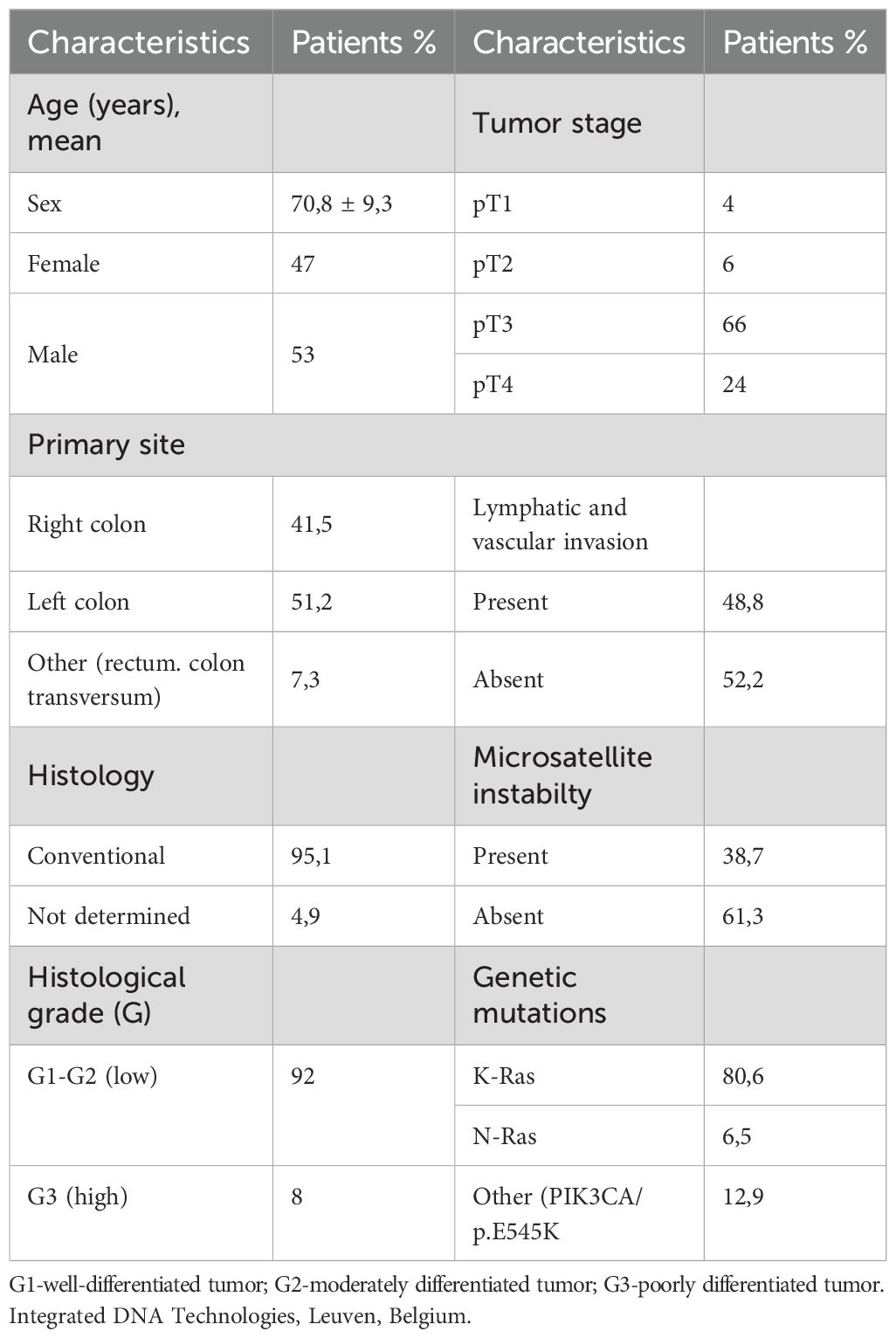 The mean age of the CRC patients was 70,8 years, with 47,4% being female. The clinicopathological characteristics of the patients are summarized in Table 1B. More than 70% of the CRC cases were moderately differentiated G2 (Figure 1A, with 61% classified as pT2 and 29% as pT3 (Figure 1B). Additionally, above 40% were with pN1 and pN2 lymph node invasion (Figure 1C). Currently, the observed survival time following the initial diagnosis ranges from 3 to 12 years (data not shown).
