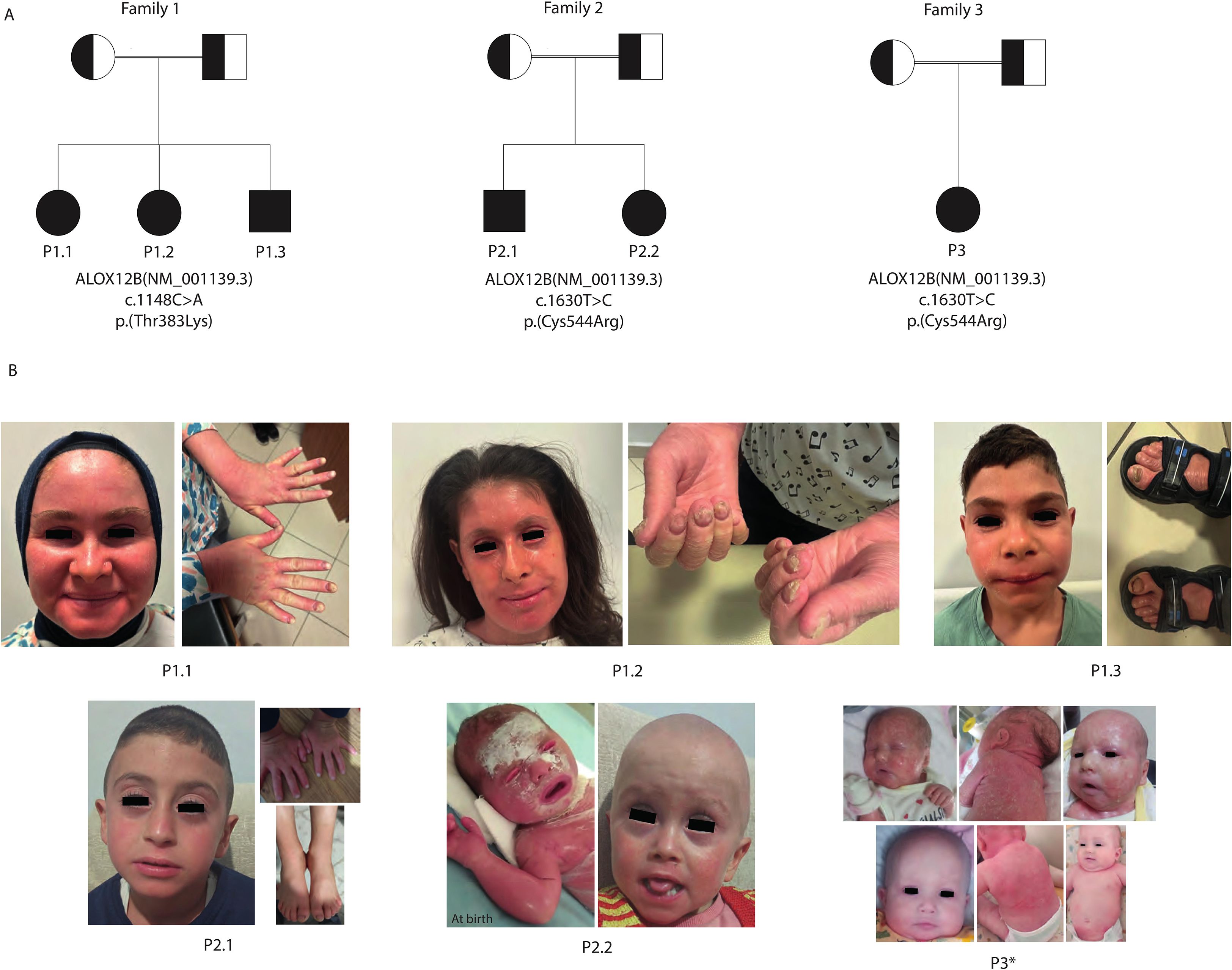 Figure 1. Pedigrees and representative dermatological findings of patients. (A) Pedigrees of the three consanguineous families (Families 1–3) illustrate autosomal recessive inheritance of ALOX12B variants. Squares represent male individuals, circles represent female individuals, filled symbols denote affected patients, and double horizontal lines indicate parental consanguinity. (B) Clinical photographs of affected patients demonstrating hallmark cutaneous features.. P1.1: Facial erythema with fine scaling and onychodystrophy. P1.2: Generalized facial erythema with fine white scaling, ectropion, periungual hyperkeratosis, and severe onychodystrophy. P1.3: Mild facial erythema with limited scaling and toenail onychodystrophy. P2.1: Mild generalized erythema with fine scaling and onychodystrophy. P2.2: Neonatal collodion membrane at birth, evolving into fine scaling, mild erythema during infancy, and alopecia totalis. P3: Self-improving collodion ichthyosis (SICI) phenotype showing severe neonatal collodion presentation with subsequent marked improvement and near-normalization of skin by infancy and alopecia totalis. These findings illustrate hallmark cutaneous features of ALOX12B deficiency, including collodion baby presentation, fine light-colored scaling with variable erythema, occasional nail changes (onychodystrophy), absence of pronounced keratoderma, and a tendency toward milder or self-improving disease course. *: Photos of P3 before (top row) and after (bottom row) systemic retinoic acid therapy.