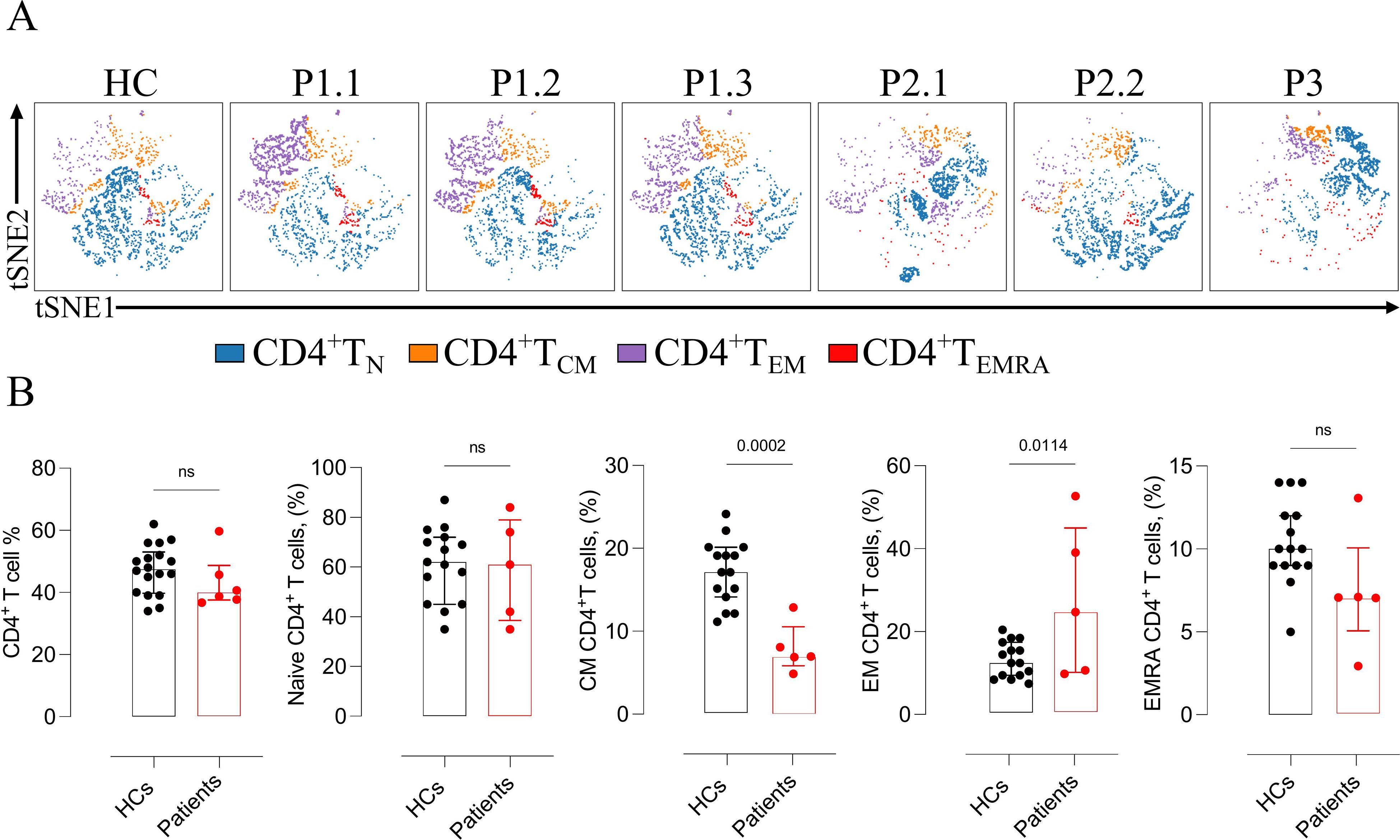 Figure 2. Altered CD4+ T-cell subset distribution in ALOX12B-deficient patients and comparison with healthy controls. (A) Representative t-SNE plots illustrating the distribution of CD4+ T-cell subsets — naïve, central memory (CM), effector memory (EM), and terminally differentiated effector memory RA+ (EMRA) — of patients. (B) Quantitative comparison of total, naïve, and memory (CM, EM, EMRA) CD4+ T-cell subsets between ALOX12B-deficient patients and age-matched healthy controls (HCs). Data are presented as individual values, with black dots representing healthy controls and red dots representing patients. Error bars indicate median with interquartile range. Statistical analysis was performed using the Mann–Whitney U test, ns: non-significant.