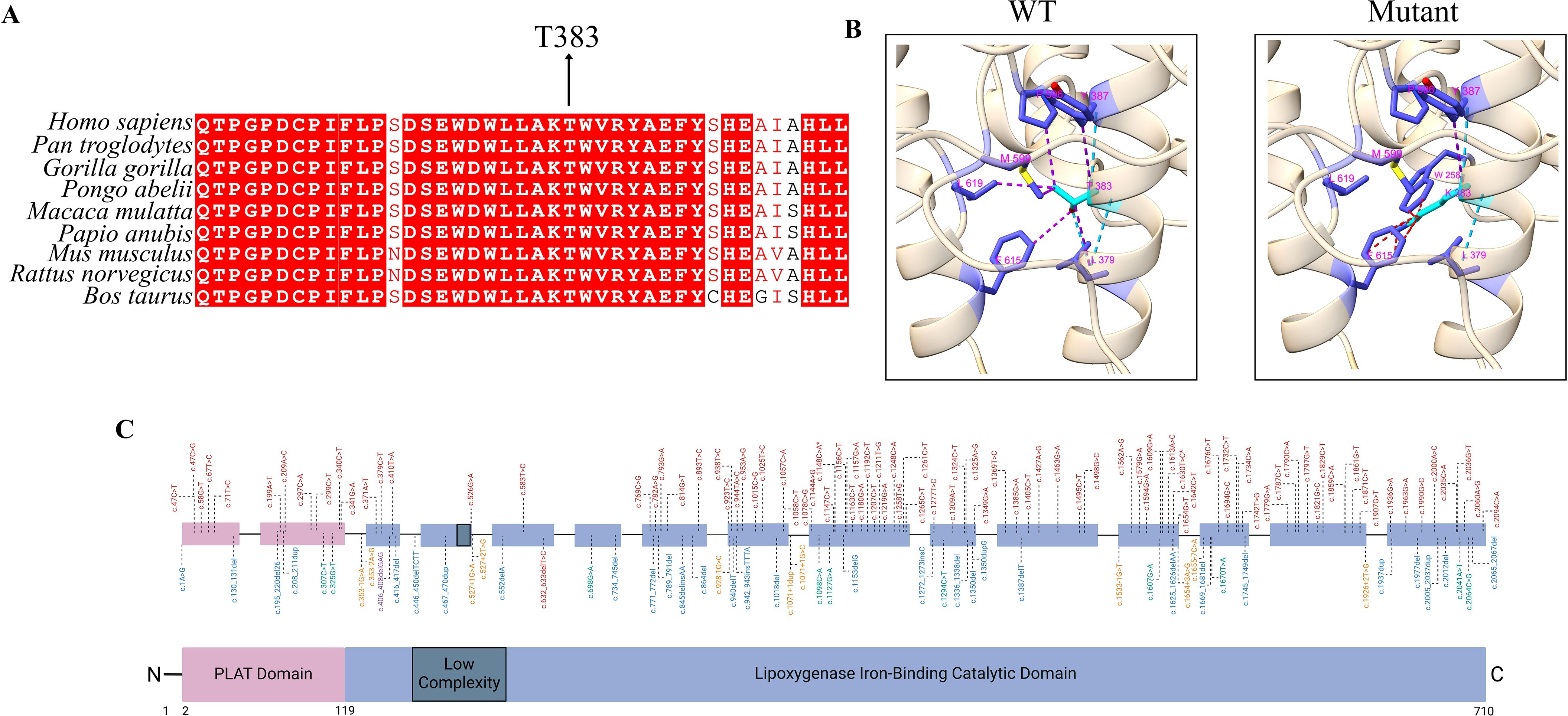 Figure 3. Evolutionary conservation, structural impact, and mutational landscape of ALOX12B gene variants. (A) Multiple sequence alignment (MSA) showing the interspecies conservation of the ALOX12B protein region spanning amino acids 360–400. The threonine residue at position 383 (highlighted) is highly conserved across species, underscoring its structural and functional importance within the catalytic domain. (B) Structural comparison of the wild-type and mutant (p.Thr383Lys) ALOX12B proteins using ChimeraX v1.10.1. Light blue lines indicate hydrogen bonds, purple lines represent contacts, and red lines denote steric clashes between residues. (C) Schematic representation of the ALOX12B (12R-lipoxygenase) protein structure and distribution of pathogenic variants. The ALOX12B protein comprises an N-terminal PLAT (polycystin-1, lipoxygenase, α-toxin) domain (pink), a central low-complexity region (dark gray), and a C-terminal iron-binding lipoxygenase catalytic domain (blue), based on transcript NM_001139.3. Pathogenic variants previously associated with autosomal recessive congenital ichthyosis (ARCI) are plotted above the schematic, color-coded by mutation type: red for missense mutations, blue for frameshift mutations, green for nonsense mutations, and yellow for non-coding mutations. The novel p.Thr383Lys and recurrent p.Cys544Arg missense variants identified in this study are indicated with asterisks (*).