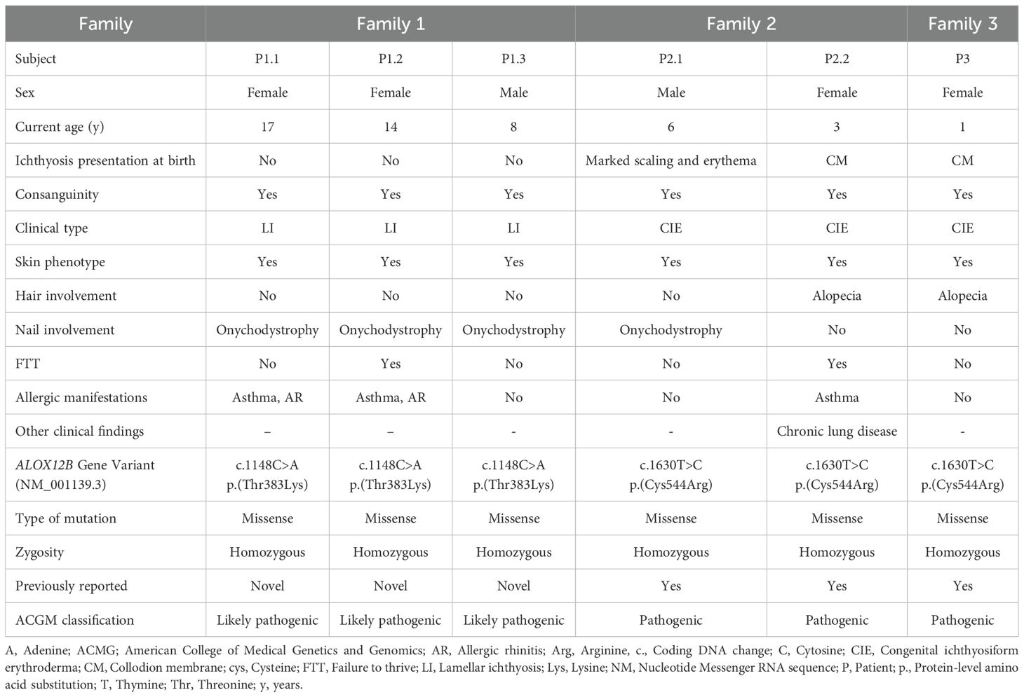 This case series highlights the complex phenotypic and immunologic spectrum associated with ALOX12B-related ARCI. Although traditionally considered a dermatologic condition, our findings demonstrate that ALOX12B variants may also be associated with systemic manifestations and immune dysregulation, emphasizing the importance of a multidisciplinary diagnostic and therapeutic approach. While previously published cohorts have reported limited genotype–phenotype correlations in ARCI, with ALOX12B variants typically linked to mild-to-moderate ichthyosis or self-improving collodion baby phenotypes, our data expand this clinical spectrum (1, 3, 8, 23). Notably, we observed that identical pathogenic variants can give rise to highly divergent disease severity and progression, even among affected individuals within the same family.